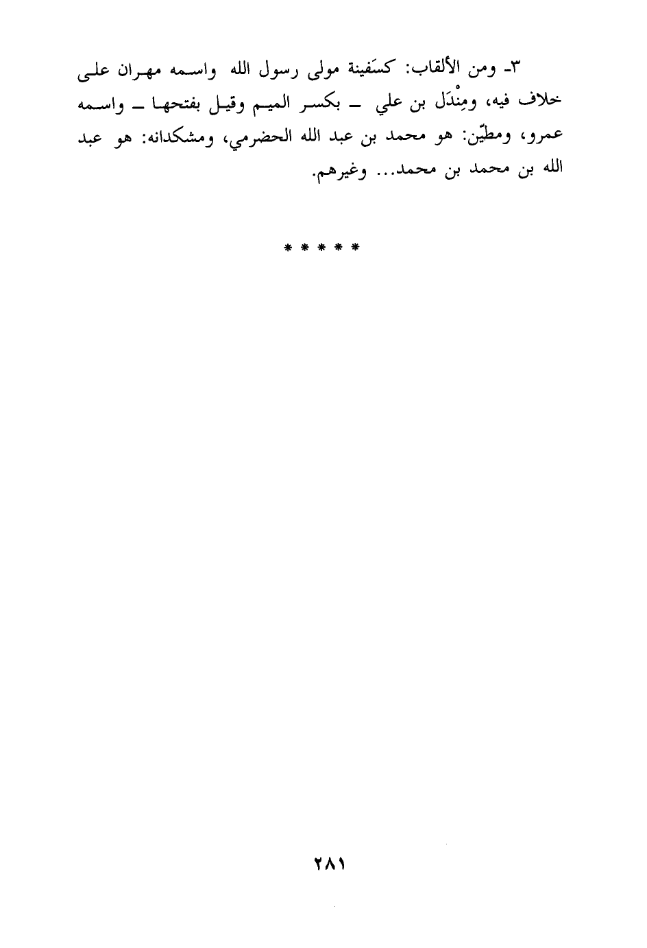 3- ومن الألقاب: كسَفينة مولى رسول الله صلى الله عليه وسلم واسمه مهران على خلاف فيه، ومِنْدَل بن علي - بكسر الميم وقيل بفتحها - واسمه عمرو، ومطيّن: هو محمد بن عبد الله الحضرمي، ومشكدانه: هو عبد الله بن محمد بن محمد ... وغيرهم.