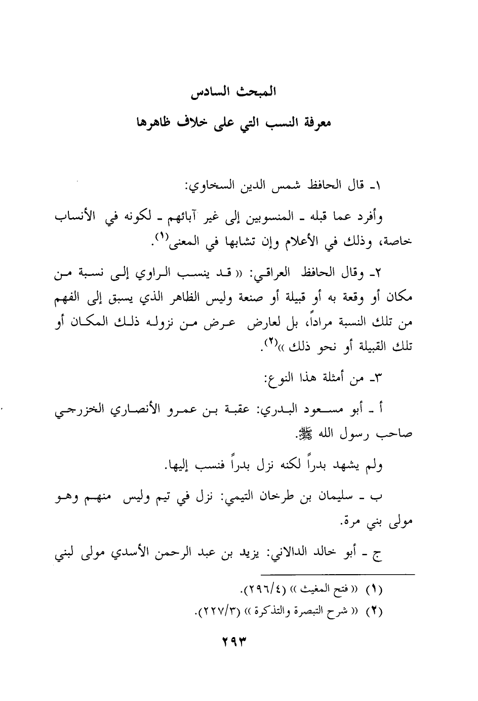 2- وقال الحافظ العراقي: "قد ينسب الراوي إلى نسبة من مكان أو وقعة به أو قبيلة أو صنعة وليس الظاهر الذي يسبق إلى الفهم من تلك النسبة مراداً، بل لعارض عرض من نزوله ذلك المكان أو تلك القبيلة أو نحو ذلك". 2
