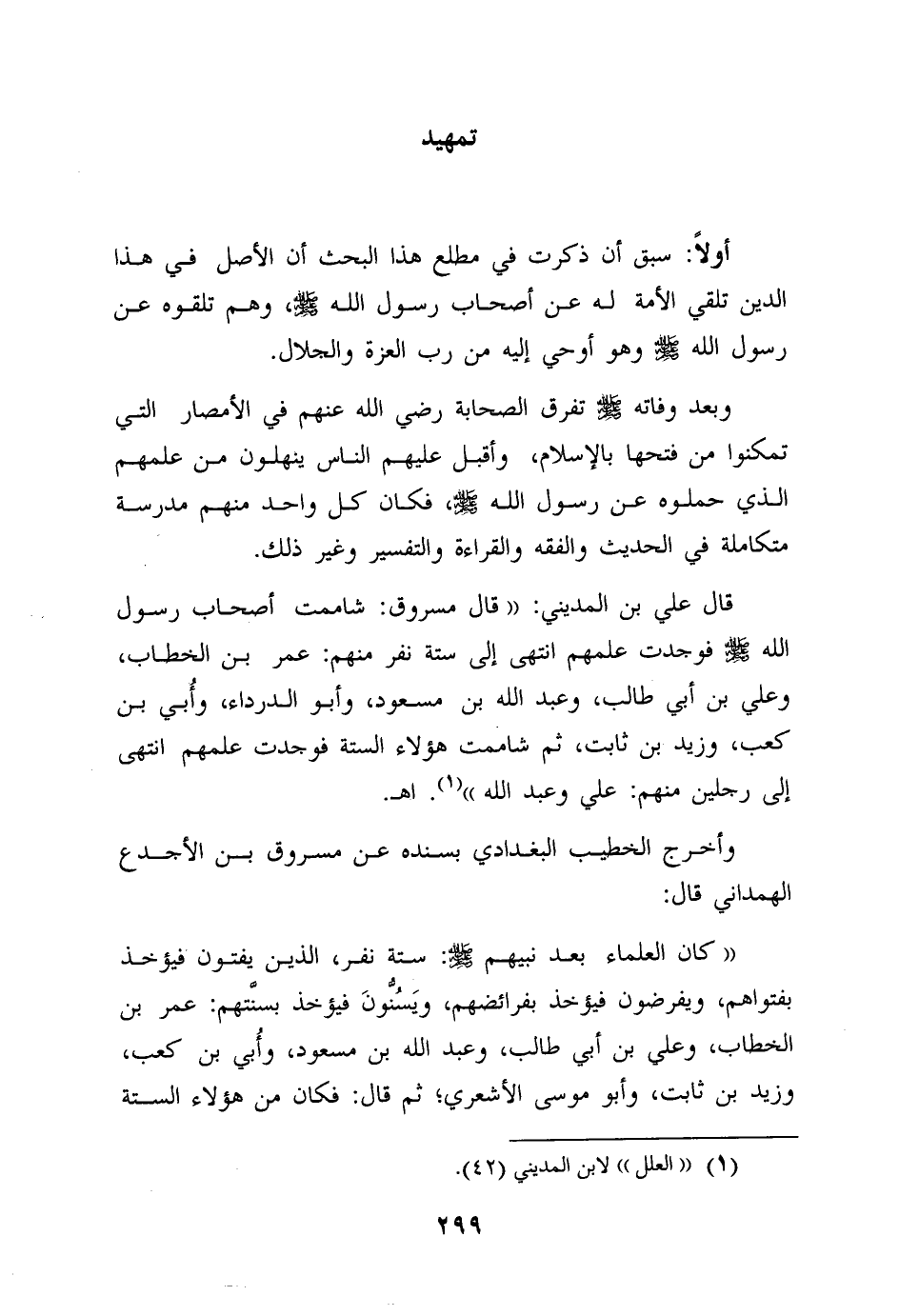 قال علي بن المديني: "قال مسروق: شاممت أصحاب رسول الله صلى الله عليه وسلم فوجدت علمهم انتهى إلى ستة نفر منهم: عمر بن الخطاب، وعلي بن أبي طالب، وعبد الله بن مسعود، وأبو الدرداء، وأبي بن كعب، وزيد بن ثابت، ثم شاممت هؤلاء الستة فوجدت علمهم انتهى إلى رجلين منهم: علي وعبد الله" 1 اهـ.