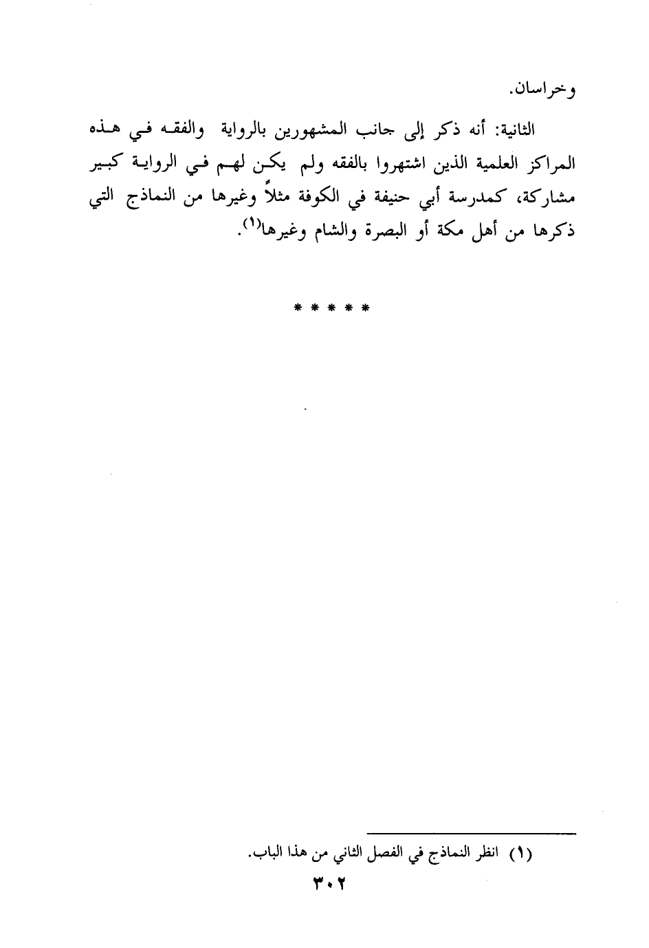 الثانية: أنه ذكر إلى جانب المشهورين بالرواية والفقه في هذه المراكز العلمية الذين اشتهروا بالفقه ولم يكن لهم فى الرواية كبير مشاركة، كمدرسة أبي حنيفة في الكوفة مثلاً وغيرها من النماذج التى ذكرها من أهل مكة أو البصرة والشام وغيرها. 1