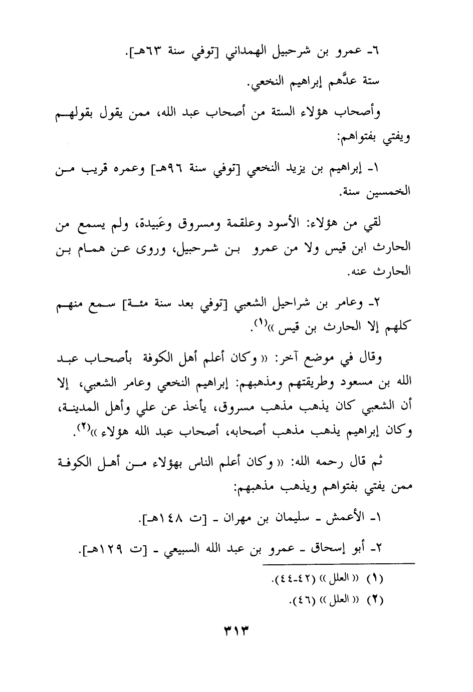 وقال في موضع آخر: "كان أعلم أهل الكوفة بأصحاب عبد الله بن مسعود وطريقتهم ومذهبهم: إبراهيم النخعي وعامر الشعبي، إلا أن الشعبي كان يذهب مذهب مسروق، يأخذ عن علي وأهل المدينة، وكان إبراهيم يذهب مذهب أصحابه، أصحاب عبد الله هؤلاء". 2
