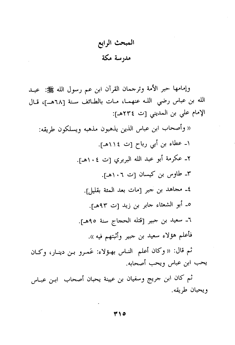 وإمامها حبر الأمة وترجمان القرآن ابن عم رسول الله صلى الله عليه وسلم: عبد الله بن عباس رضي الله عنهما، مات بالطائف (سنة 68 هـ) ، قال الإمام علي بن المديني (ت 234 هـ) :