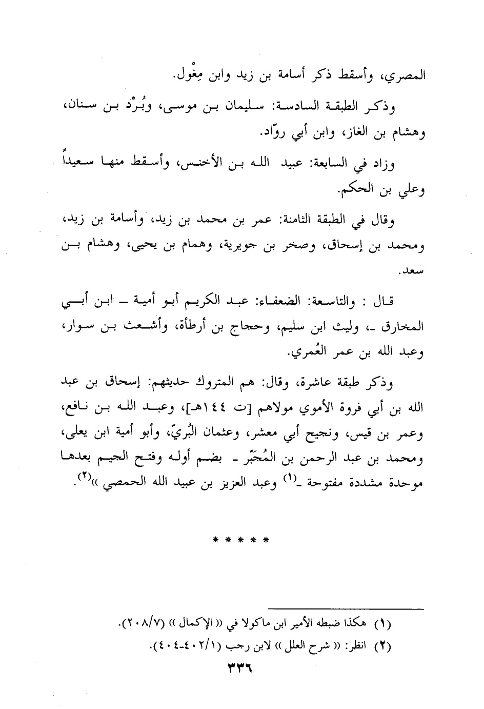 وقال في الطبقة الثامنة: عمر بن محمد بن زيد، وأسامة بن زيد، ومحمد بن إسحاق، وصخر بن جويرية، وهمام بن يحيى، وهشام بن سعد.