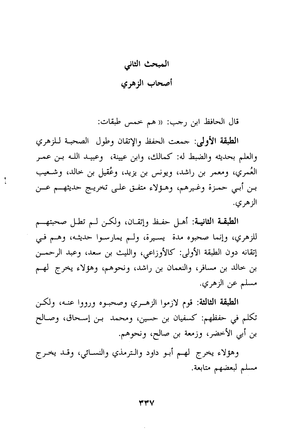 الطبقة الثانية: أهل حفظ وإتقان، ولكن لم تطل صحبتهم للزهري، وإنما صحبوه مدة يسيرة، ولم يمارسوا حديثه، وهم في إتقانه دون الطبقة الأولى: كالأوزاعي، والليث بن سعد، وعبد الرحمن بن خالد بن مسافر، والنعمان بن راشد، ونحوهم، وهؤلاء يخرج لهم مسلم عن الزهري.