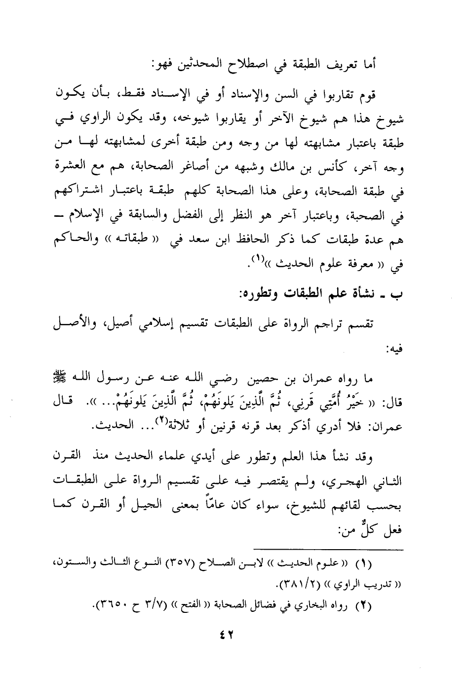 قوم تقاربوا في السن والإسناد أو في الإسناد فقط، بأن يكون شيوخ هذا هم شيوخ الآخر أو يقاربوا شيوخه، وقد يكون الراوي في طبقة باعتبار مشابهته لها من وجه ومن طبقة أخرى لمشابهته لها من وجه آخر، كأنس بن مالك وشبهه من أصاغر الصحابة، هم مع العشرة في طبقة الصحابة، وعلى هذا الصحابة كلهم طبقة باعتبار اشتراكهم في الصحبة، وباعتبار آخر هو النظر إلى الفضل والسابقة في الإسلام - هم عدة طبقات كما ذكر الحافظ ابن سعد في "طبقاته" والحاكم في "معرفة علوم الحديث". 1