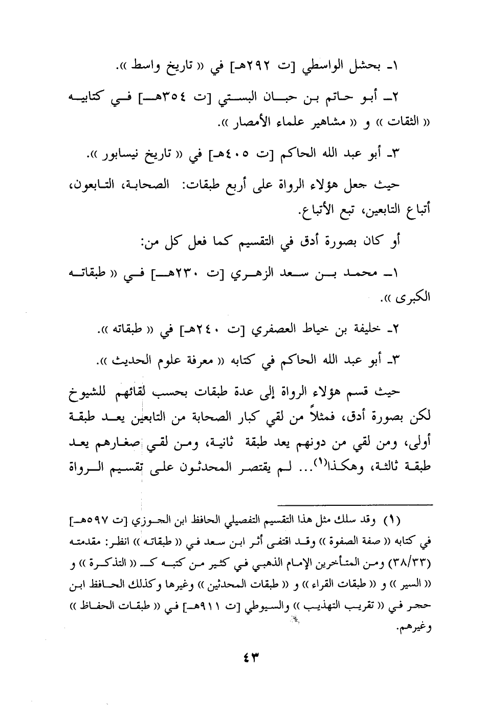 1وقد سلك مثل هذا التقسيم التفصيلي الحافظ ابن الجوزي (ت 597 هـ) في كتابه صفة الصفوة وقد اقتفى أثر ابن سعد في طبقاته. انظر: مقدمته (33 / 38) ، ومن المتأخرين الإمام الذهبي في كثير من كتبه كـ التذكرة والسير وطبقات القراء وطبقات المحدثين وغيرها وكذلك الحافظ ابن حجر في تقريب التهذيب والسيوطي (ت 911 هـ) في طبقات الحفاظ وغيرهم.