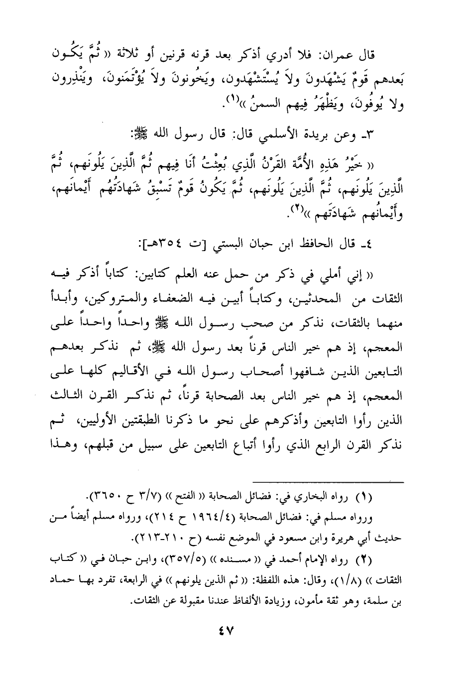 2رواه الإمام أحمد في المسند (5 / 357) ، وابن حبان في كتاب الثقات (8 / 1) ، وقال: هذه اللفظة: "ثم الذين يلونهم" في الرابعة، تفرد بها حماد بن سلمة، وهو ثقة مأمون، وزيادة الألفاظ عندنا مقبولة عن الثقات.