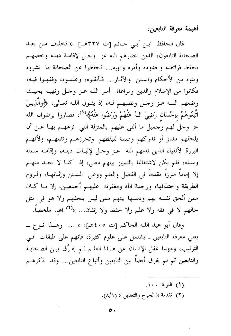قال الحافظ ابن أبي حاتم (ت 327 هـ) : فخلف من بعد الصحابة التابعون، الذين اختارهم الله عز وجل لإقامة دينه وخصهم بحفظ فرائضه وحدوده وأمره ونهيه ... فحفظوا عن الصحابة ما نشروه وبثوه من الأحكام والسنن والآثار ... فأتقنوه، وعلموه، وفقهوا فيه، فكانوا من الإسلام والدين ومراعاة أمر الله عز وجل ونهيه بحيث وضعهم الله عز وجل ونصبهم له، إذ يقول الله تعالى: {وَالَّذِينَ اتَّبَعُوهُمْ بِإِحْسَانٍ رَضِيَ اللهُ عَنْهُمْ وَرَضُوا عَنْهُ} 1، فصاروا برضوان الله عز وجل لهم وجميل ما أثنى عليهم بالمنزلة التي نزههم بها عن أن يلحقهم مغمز أو تدركهم وصمة لتيقظهم وتحرزهم وتثبتهم، ولأنهم البررة الأتقياء الذين ندبهم الله عز وجل لإثبات دينه، وإقامة سننه وسبله، فلم يكن لاشتغالنا بالتمييز بينهم معنى، إذ كنا لا نجد منهم إلا إماماً مبرزاً مقدماً في الفضل والعلم ووعي السنن وإثباتها، ولزوم الطريقة واحتذائها، ورحمة الله ومغفرته عليهم أجمعين، إلا ما كان ممن ألحق نفسه بهم ودلسها بينهم ممن ليس يلحقهم ولا هو في مثل حالهم لا في فقه ولا علم ولا حفظ ولا إتقان" 2 اهـ ملخصاً.
