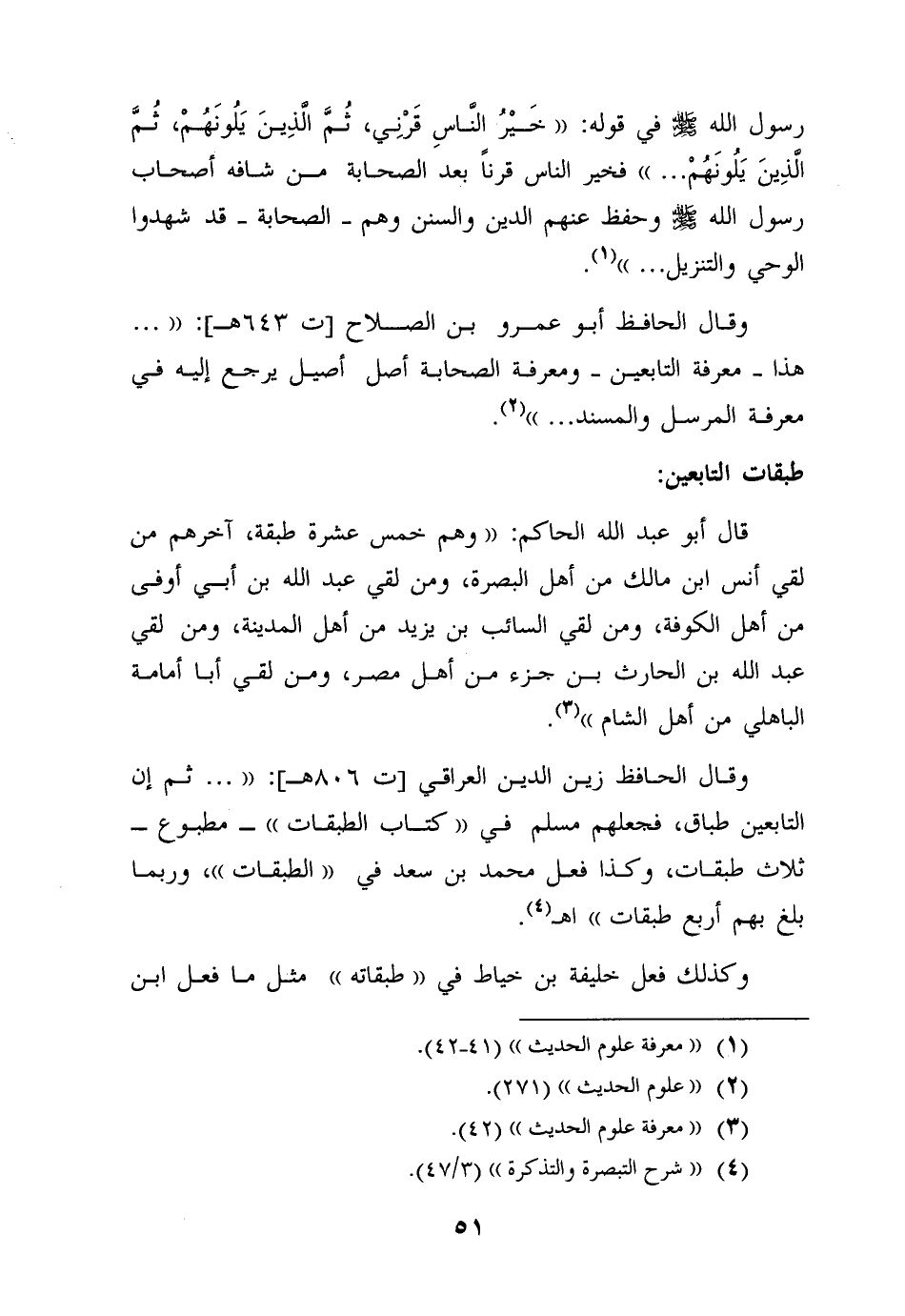 وقال الحافظ زين الدين العراقي (ت 806 هـ) : " ثم إن التابعين طباق، فجعلهم مسلم في كتاب "الطبقات" - مطبوع - ثلاث طبقات، وكذا فعل محمد بن سعد في "الطبقات"، وربما بلغ بهم أربع طبقات" اهـ. 4