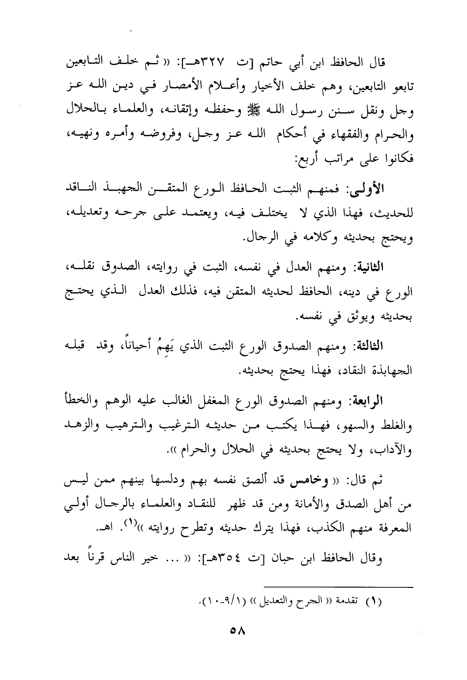 الثانية: ومنهم العدل في نفسه، الثبت في روايته، الصدوق نقله، الورع في دينه، الحافظ لحديثه المتقن فيه، فذلك العدل الذي يحتج بحديثه ويوثق في نفسه.