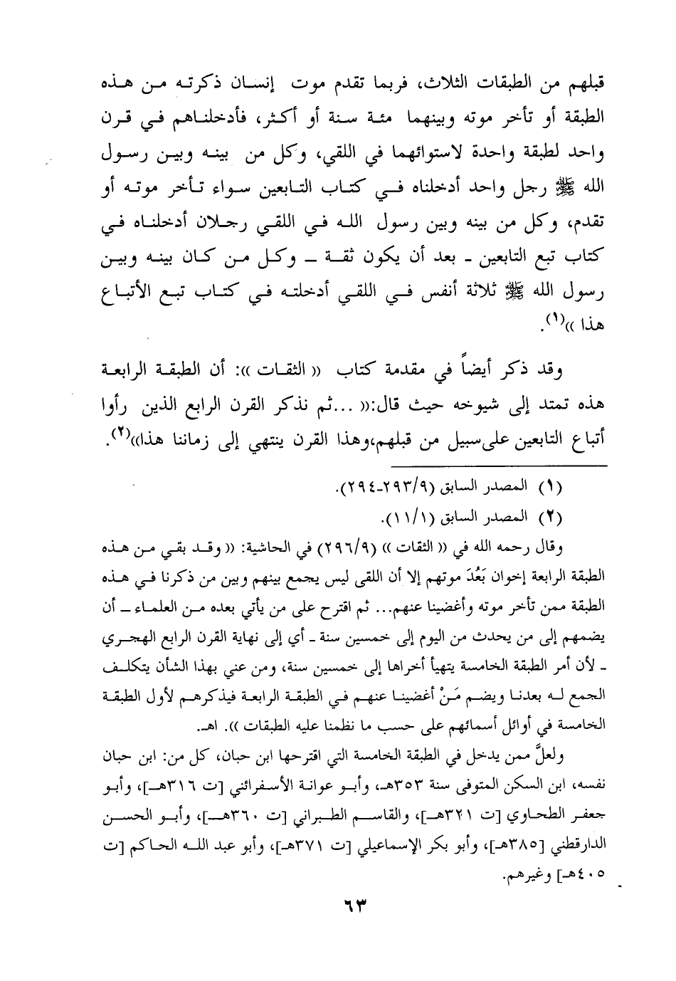 وقد ذكر أيضاً في مقدمة كتاب "الثقات": أن الطبقة الرابعة هذه تمتد إلى شيوخه حيث قال: "ثم نذكر القرن الرابع الذين رأوا أتباع التابعين على سبيل من قبلهم، وهذا القرن ينتهي إلى زماننا هذا". 2