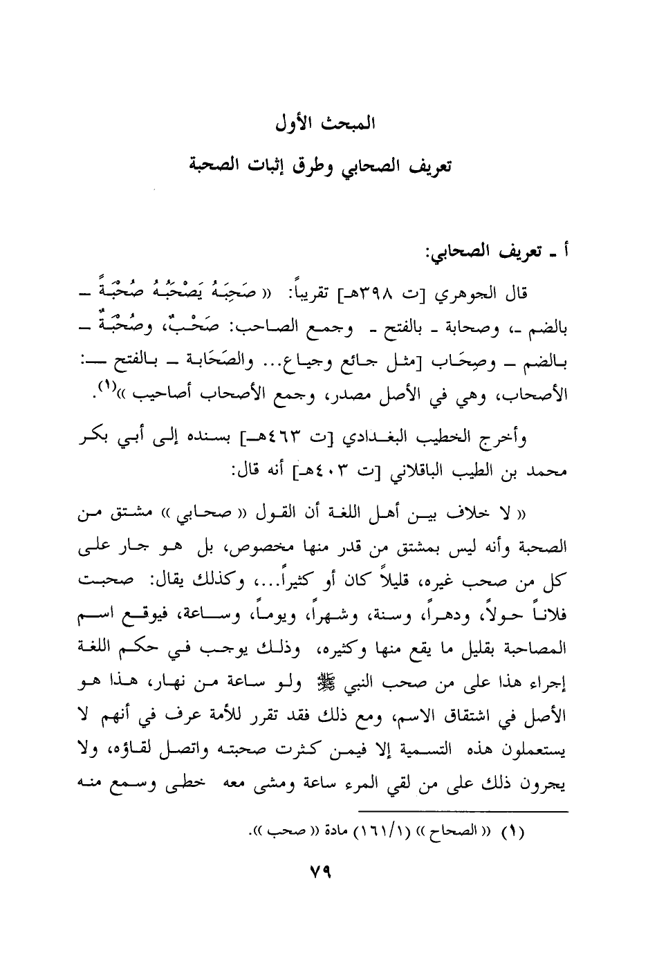 "لا خلاف بين أهل اللغة أن القول "صحابي" مشتق من الصحبة وأنه ليس بمشتق من قدر منها مخصوص، بل هو جار على كل من صحب غيره، قليلاً كان أو كثيراً ... ، وكذلك يقال: صحبت فلاناً حولاً، ودهراً، وسنة، وشهراً، ويوماً، وساعة، فيوقع اسم المصاحبة بقليل ما يقع منها وكثيره، وذلك يوجب في حكم اللغة إجراء هذا على من صحب النبي صلى الله عليه وسلم ولو ساعة من نهار، هذا هو الأصل في اشتقاق الاسم، ومع ذلك فقد تقرر للأئمة عرف في أنهم لا يستعملون هذه التسمية إلا فيمن كثرت صحبته واتصل لقاؤه، ولا يجرون ذلك على من لقي المرء ساعة ومشى معه خطى وسمع منه