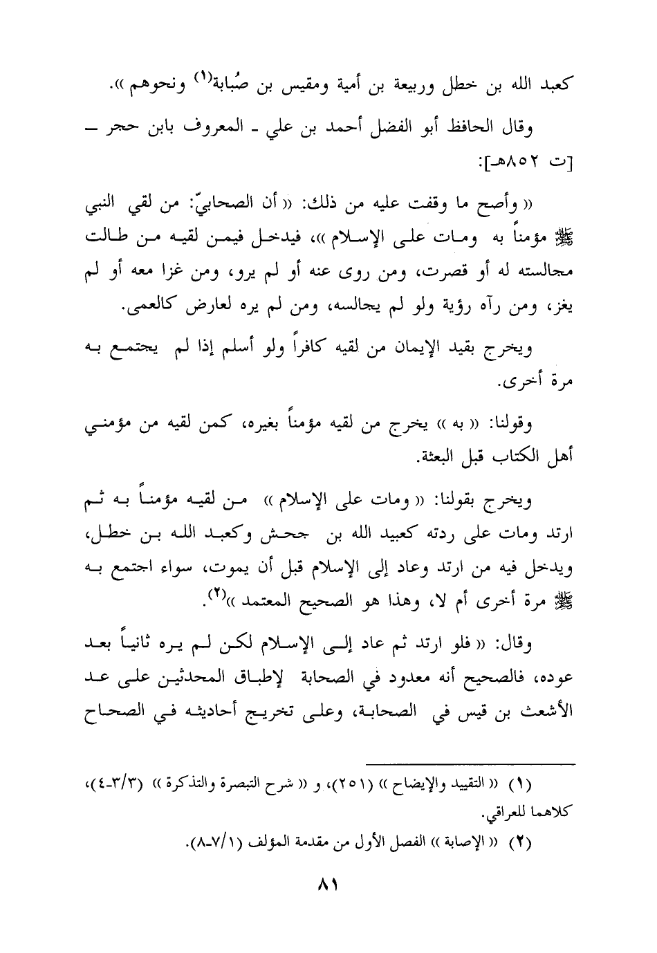 ويخرج بقولنا: "ومات على الإسلام" من لقيه مؤمنأ به ثم ارتد ومات على ردته كعبيد الله بن جحش وكعبد الله بن خطل، ويدخل فيه من ارتد وعاد إلى الإسلام قبل أن يموت، سواء اجتمع به صلى الله عليه وسلم مرة أخرى أم لا، وهذا هو الصحيح المعتمد". 2