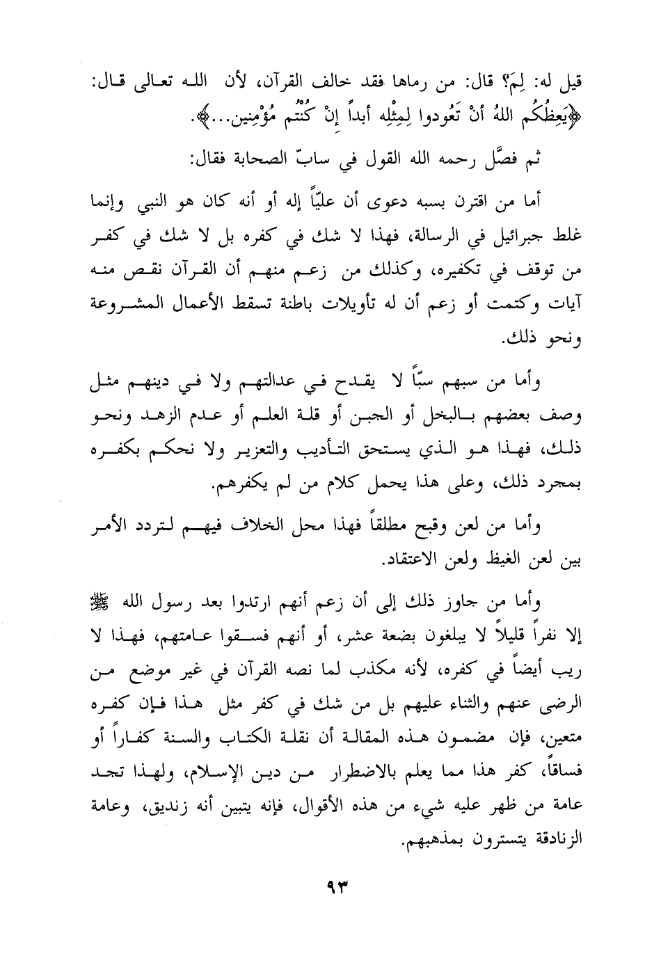 وأما من جاوز ذلك إلى أن زعم أنهم ارتدوا بعد رسول الله صلى الله عليه وسلم إلا نفراً قليلاً لا يبلغون بضعة عشر، أو أنهم فسقوا عامتهم، فهدا لا ريب أيضاً في كفره، لأنه مكذب لما نصه القرآن في غير موضع من الرضى عنهم والثناء عليهم بل من شك في كفر مثل هذا فإن كفره متعين، فإن مضمون هذه المقالة أن نقلة الكتاب والسنة كفارٌ أو فساقٌ، كفر هذا مما يعلم بالاضطرار من دين الإسلام، ولهذا تجد عامة من ظهر عليه شيء من هذه الأقوال، فإنه يتبين أنه زنديق، وعامة الزنادقة يتسترون بمذهبهم.