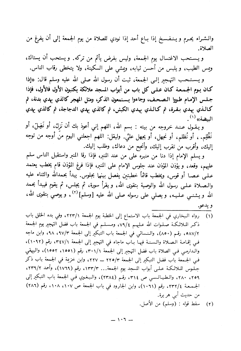 ويستحب الاغتسال يوم الجمعة، وليس بفرض يأثم من تركه ويستحب أن يستاك، ويمس الطيب، ويلبس من أحسن ثيابه ويمشي عَلَى السكينة، وَلا يتخطى رقاب الناس، ويستحب التهجير إِلَى الجمعة، ثبت أَنَّ رَسُولَ اللَّهِ صَلَّى اللَّهُ عَلَيْهِ وَسَلَّمَ، قَالَ: «إذا كَانَ يوم الجمعة كَانَ عَلَى كل باب من أبواب المسجد ملائكة يكتبون الأول فالأول، فإذا جلس الإمام طووا الصحف، وجاءوا يستمعون الذكر ومثل المهجر كالذي يهدي بدنة، ثم كالذي يهدي بقرة، ثم كالذي يهدي الكبش، ثم كالذي يهدي الدجاجة، ثم كالذي يهدي البيضة» .