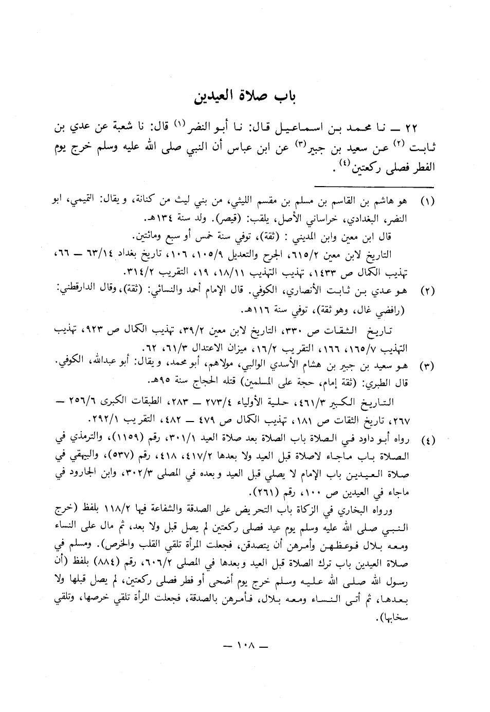 22 - نا مُحَمَّدُ بْنُ إِسْمَاعِيلَ، قَالَ: نا أَبُو النَّصْرِ، قَالَ: نا شُعْبَةُ، عَنِ ابْنِ ثَابِتٍ، عَنْ سَعِيدِ بْنِ جُبَيْرٍ، عَنِ ابْنِ عَبَّاسٍ، «أَنَّ النَّبِيَّ صَلَّى اللَّهُ عَلَيْهِ وَسَلَّمَ خَرَجَ يَوْمَ الْفِطْرِ فَصَلَّى رَكْعَتَيْنِ»
