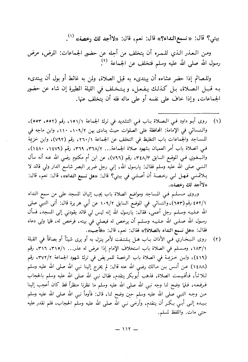 ومن العذر الذي للمرء أن يتخلف من أجله عن حضور الجماعات المرض، «مرض رَسُول اللَّهِ صَلَّى اللَّهُ عَلَيْهِ وَسَلَّمَ فتخلف عن الجماعة» .