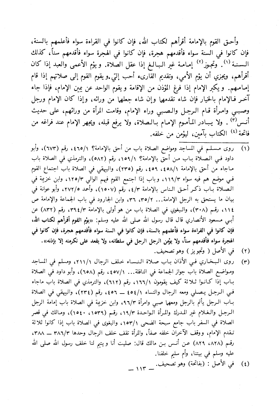 وأحق القوم بالإمامة أقرؤهم لكتاب اللَّه، فإن كانوا في القراءة سواء فأعلمهم بالسنة، فإن كانوا في السنة سواء فأقدمهم هجرة، فإن كانوا في الهجرة سواء فأقدمهم سنا، كذلك السنة.