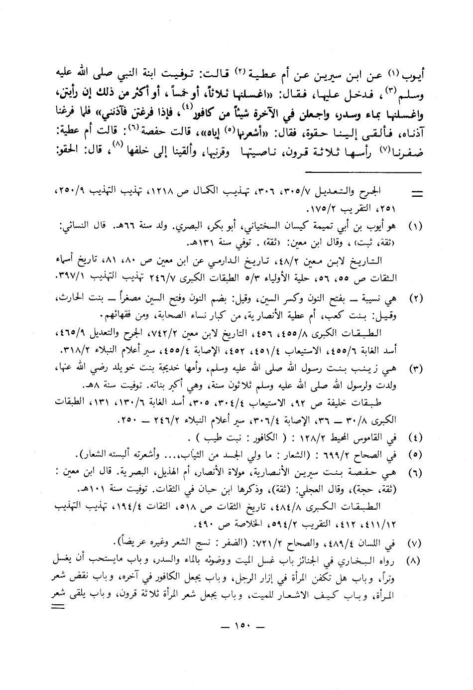أَيُّوبَ، عَنِ ابْنِ سِيرِينَ، عَنْ أُمِّ عَطِيَّةَ، قَالَتْ: " تُوُفِّيَتِ ابْنَةُ النَّبِيِّ صَلَّى اللَّهُ عَلَيْهِ وَسَلَّمَ، فَدَخَلَ عَلَيْهَا، فَقَالَ: اغْسِلْنَهَا ثَلاثًا أَوْ خَمْسًا أَوْ أَكْثَرَ مِنْ ذَلِكَ إِنْ رَأَيْتُنَّ، وَاغْسِلْنَهَا بِمَاءٍ وَسِدْرٍ، وَاجْعَلْنَ فِي الآخِرَةِ شَيْئًا مِنْ كَافُورٍ، فَإِذَا فَرَغْتُنَّ فَآذِنَنِّي.