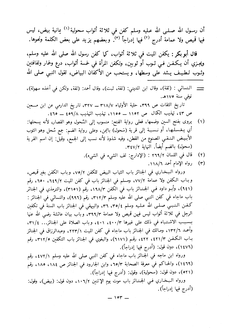 أَنَّ رَسُولَ اللَّهِ صَلَّى اللَّهُ عَلَيْهِ وَسَلَّمَ «كُفِّنَ فِي ثَلاثَةَ أَثْوَابٍ سَحُولِيَّةٍ يَمَانِيَّةٍ بِيضٍ لَيْسَ فِيهَا قَمِيصٌ، وَلا عِمَامَةٌ أُدْرِجَ فِيهَا إِدْرَاجًا» ، وَبَعْضُهُمْ يَزِيدُ عَلَى بَعْضِ الْكَلِمَةِ وَنَحْوِهَا