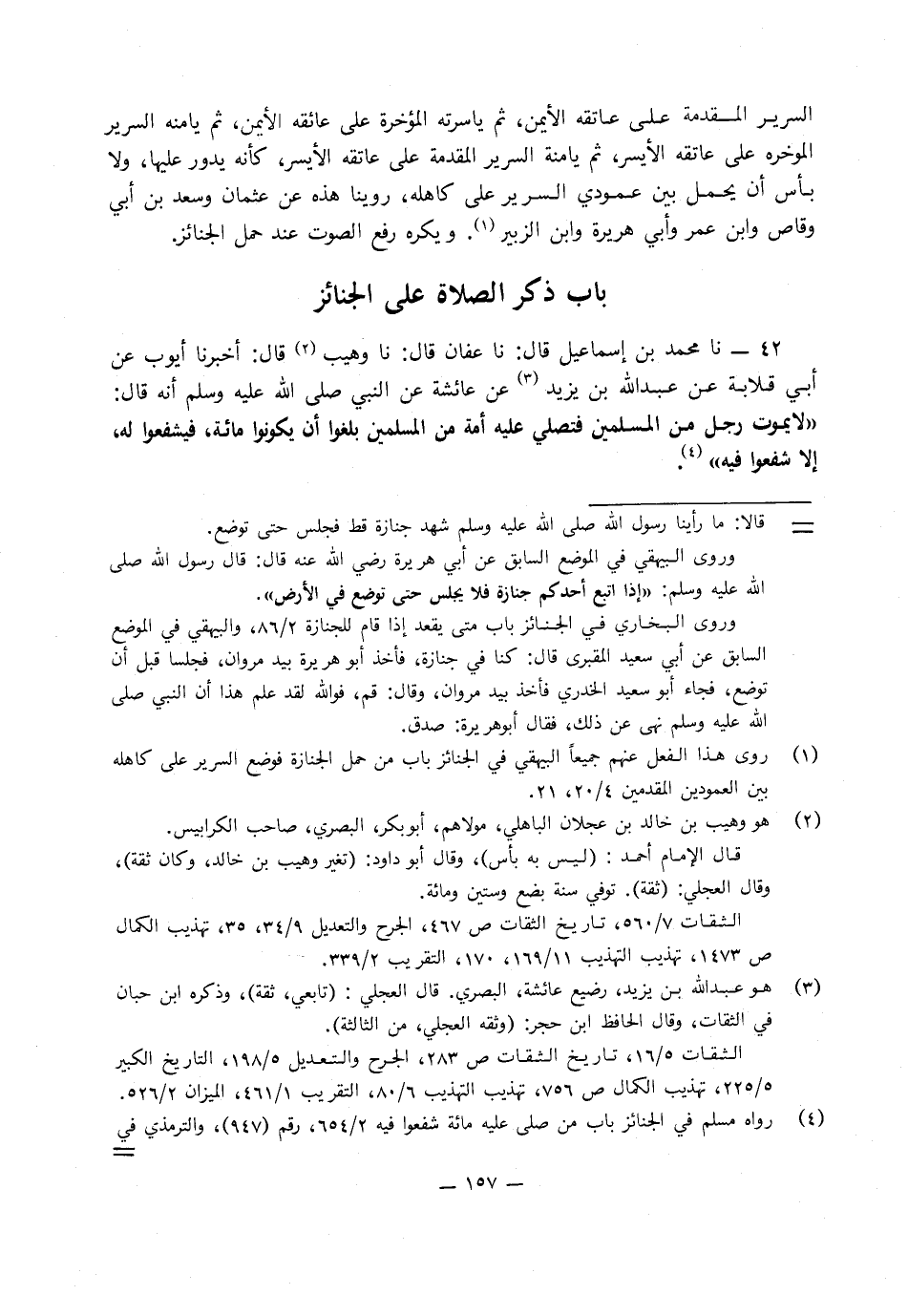 42 - نا مُحَمَّدُ بْنُ إِسْمَاعِيلَ، قَالَ: نا عَفَّانُ، قَالَ: نا وُهَيْبٌ، قَالَ: أَخْبَرَنَا أَيُّوبُ، عَنْ أَبِي قِلابَةَ، عَنْ عَبْدِ اللَّهِ بْنِ يَزِيدَ، عَنْ عَائِشَةَ، عَنِ النَّبِيِّ صَلَّى اللَّهُ عَلَيْهِ وَسَلَّمَ، أَنَّهُ قَالَ: «لا يَمُوتُ رَجُلٌ مِنَ الْمُسْلِمِينَ فَتُصَلِّي عَلَيْهِ أُمَّةٌ مِنَ الْمُسْلِمِينَ بَلَغُوا أَنْ يَكُونُوا مِائَةً يَشْفَعُونَ لَهُ إِلا شُفِّعُوا فِيهِ»
