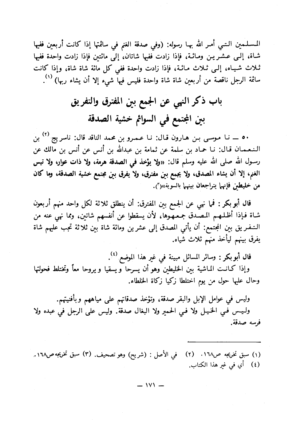 باب ذكر النهي عن الجمع بين المفترق والتفريق بين المجتمع في السوائم خشية الصدقة