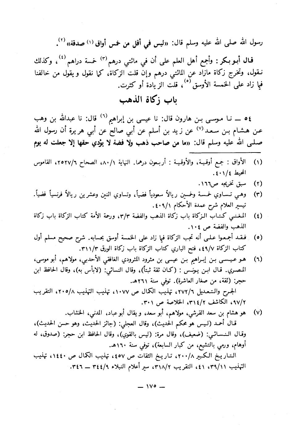 54 - نا مُوسَى بْنُ هَارُونَ، قَالَ نا عِيسَى بْنُ إِبْرَاهِيمَ، قَالَ: نا عَبْدُ اللَّهِ بْنُ وَهْبٍ، عَنْ هِشَامِ بْنِ سَعْدٍ، عَنْ زَيْدِ بْنِ أَسْلَمَ، عَنْ أَبِي صَالِحٍ، عَنْ أَبِي هُرَيْرَةَ، أَنَّ رَسُولَ اللَّهِ صَلَّى اللَّهُ عَلَيْهِ وَسَلَّمَ، قَالَ: «مَا مِنْ صَاحِبِ ذَهَبٍ وَلا فِضَّةٍ لا يُؤَدِّي حَقَّهَا إِلا جُعِلَتْ لَهُ يَوْمَ