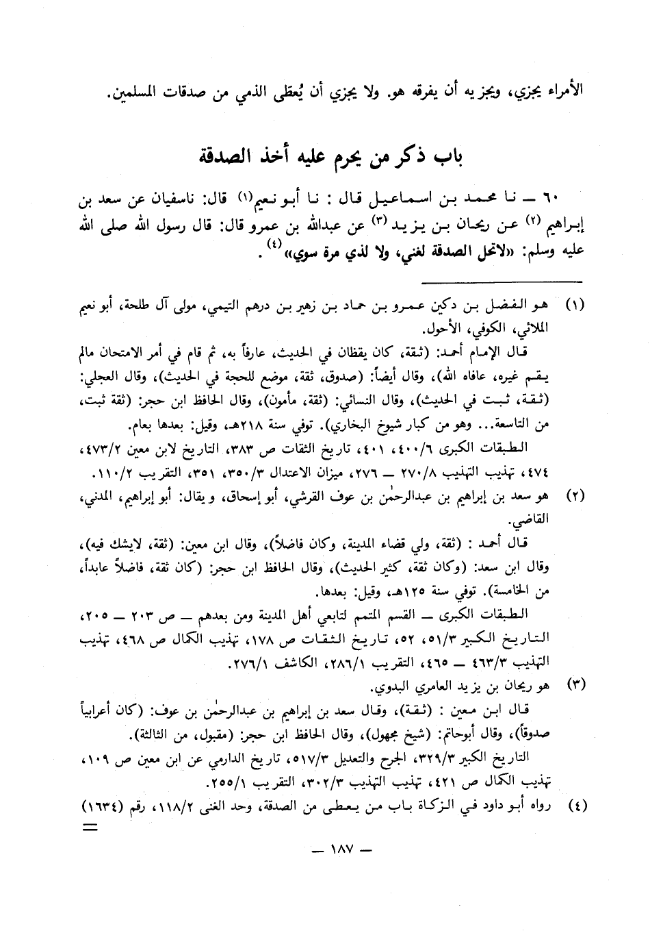 60 - نا مُحَمَّدُ بْنُ إِسْمَاعِيلَ، قَالَ: نا نُعَيْمٌ، قَالَ: نا سُفْيَانُ، عَنْ سَعْدِ بْنِ إِبْرَاهِيمَ، عَنْ رَيْحَانَ بْنِ يَزِيدَ، عَنْ عَبْدِ اللَّهِ بْنِ عَمْرٍو، قَالَ: قَالَ رَسُولُ اللَّهِ صَلَّى اللَّهُ عَلَيْهِ وَسَلَّمَ: «لا تَحِلُّ الصَّدَقَةُ لِغَنِيٍّ وَلا لِذِي مِرَّةٍ سَوِيٍّ»