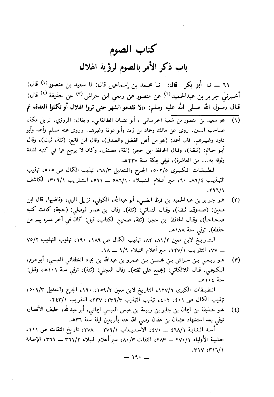 61 - نا مُحَمَّدُ بْنُ إِسْمَاعِيلَ، قَالَ: نا سَعِيدُ بْنُ مَنْصُورٍ، قَالَ: أَخْبَرَنِي جَرِيرُ بْنُ عَبْدِ الْحَمِيدِ، عَنْ مَنْصُورٍ، عَنْ رِبْعِيِّ بْنِ حِرَاشٍ، عَنْ حُذَيْفَةَ، قَالَ: قَالَ رَسُولُ اللَّهِ صَلَّى اللَّهُ عَلَيْهِ وَسَلَّمَ: «لا تَقَدَّمُوا الشَّهْرَ حَتَّى تَرَوُا الْهِلالَ أَوْ تُكْمِلُوا الْعِدَّةَ، ثُمَّ