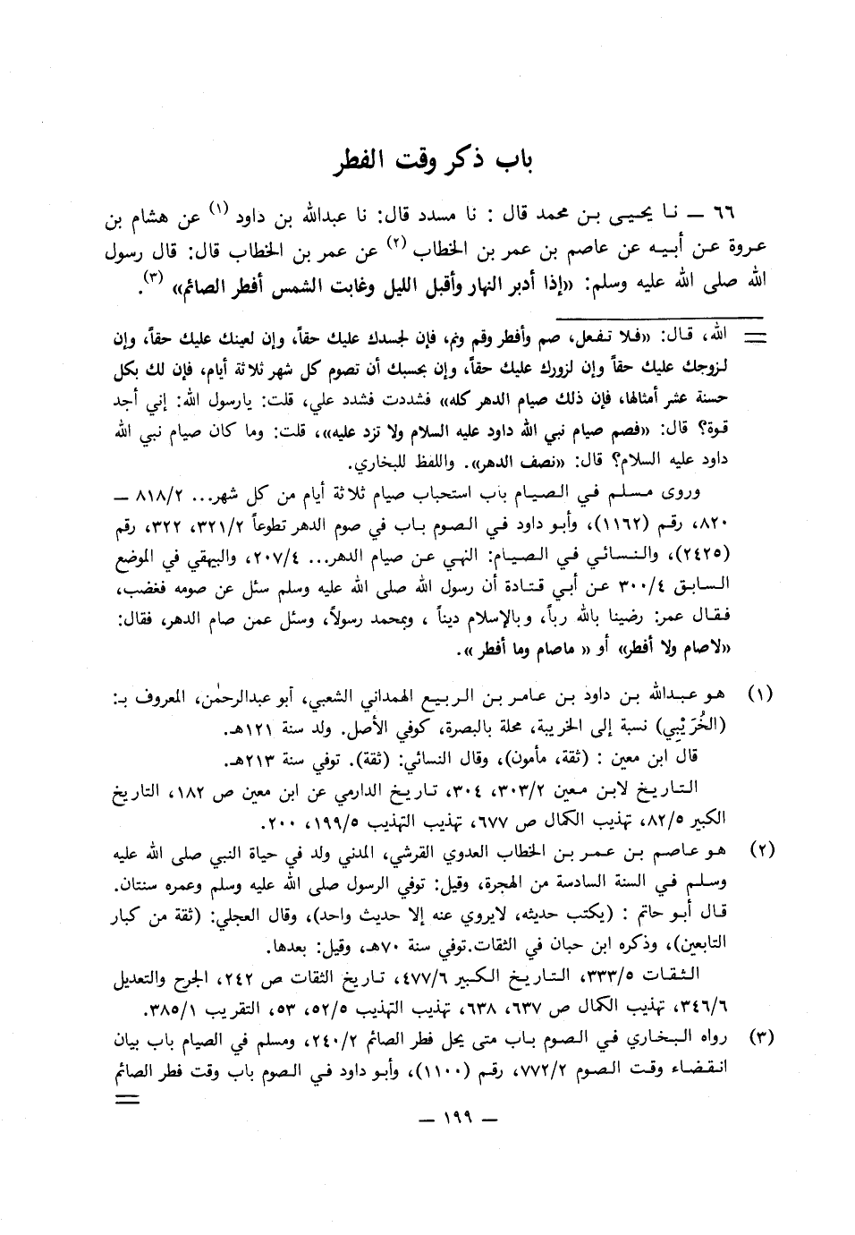 66 - نا يَحْيَى بْنُ مُحَمَّدٍ، قَالَ: نا مُسَدَّدٌ، قَالَ: نا عَبْدُ اللَّهِ بْنُ دَاوُدَ، عَنْ هِشَامِ بْنِ عُرْوَةَ، عَنْ أَبِيهِ، عَنْ عَاصِمِ بْنِ عُمَرَ بْنِ الْخَطَّابِ، عَنْ عُمَرَ بْنِ الْخَطَّابِ، قَالَ: قَالَ رَسُولُ اللَّهِ صَلَّى اللَّهُ عَلَيْهِ وَسَلَّمَ: «إِذَا أَدْبَرَ النَّهَارُ وَأَقْبَلَ اللَّيْلُ وَغَابَتِ الشَّمْسُ أَفْطَرَ الصَّائِمُ»