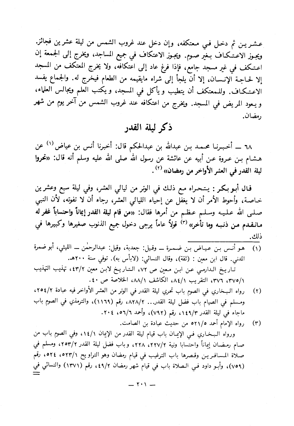 68 - أَخْبَرَنَا مُحَمَّدُ بْنُ عَبْدِ اللَّهِ بْنِ عَبْدِ الْحَكَمِ، قَالَ: أَخْبَرَنَا أَنَسُ بْنُ عِيَاضٍ، عَنْ هِشَامِ بْنِ عُرْوَةَ، عَنْ أَبِيهِ، عَنْ عَائِشَةَ، عَنْ رَسُولِ اللَّهِ صَلَّى اللَّهُ عَلَيْهِ وَسَلَّمَ، أَنَّهُ قَالَ: «تَحَرَّوْا لَيْلَةَ الْقَدْرِ فِي الْعَشْرِ الأَوَاخِرِ مِنْ رَمَضَانَ»