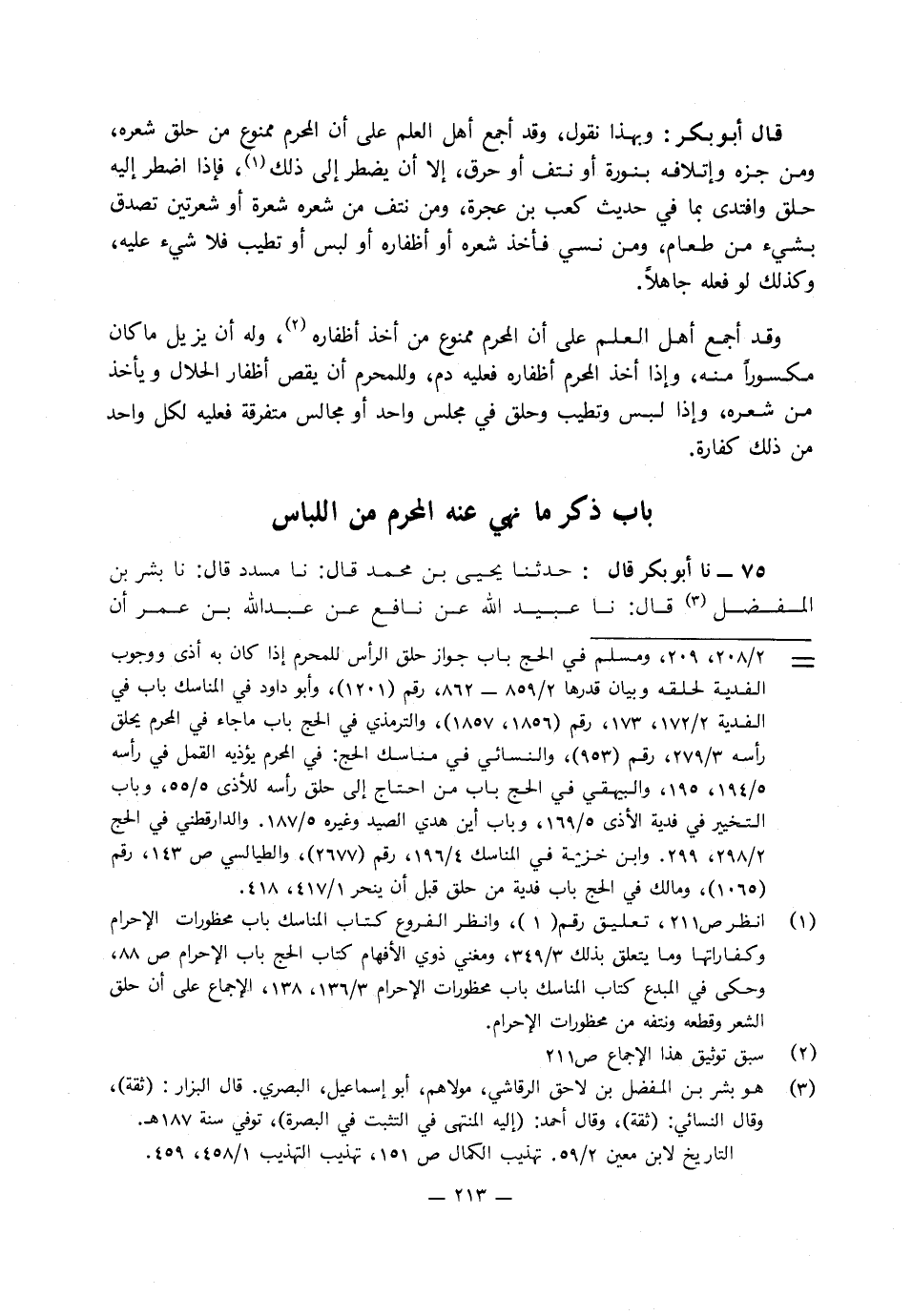 وبهذا نقول وقد أجمع أهل العلم عَلَى أن المحرم ممنوع من حلق شعره، ومن جزه وإتلافه بنورة أو نتف أو حرق إلا أن يضطر إِلَى ذَلِكَ، فإذا أضطر إليه حلق وافتدى بما في حديث كعب بن عجرة.