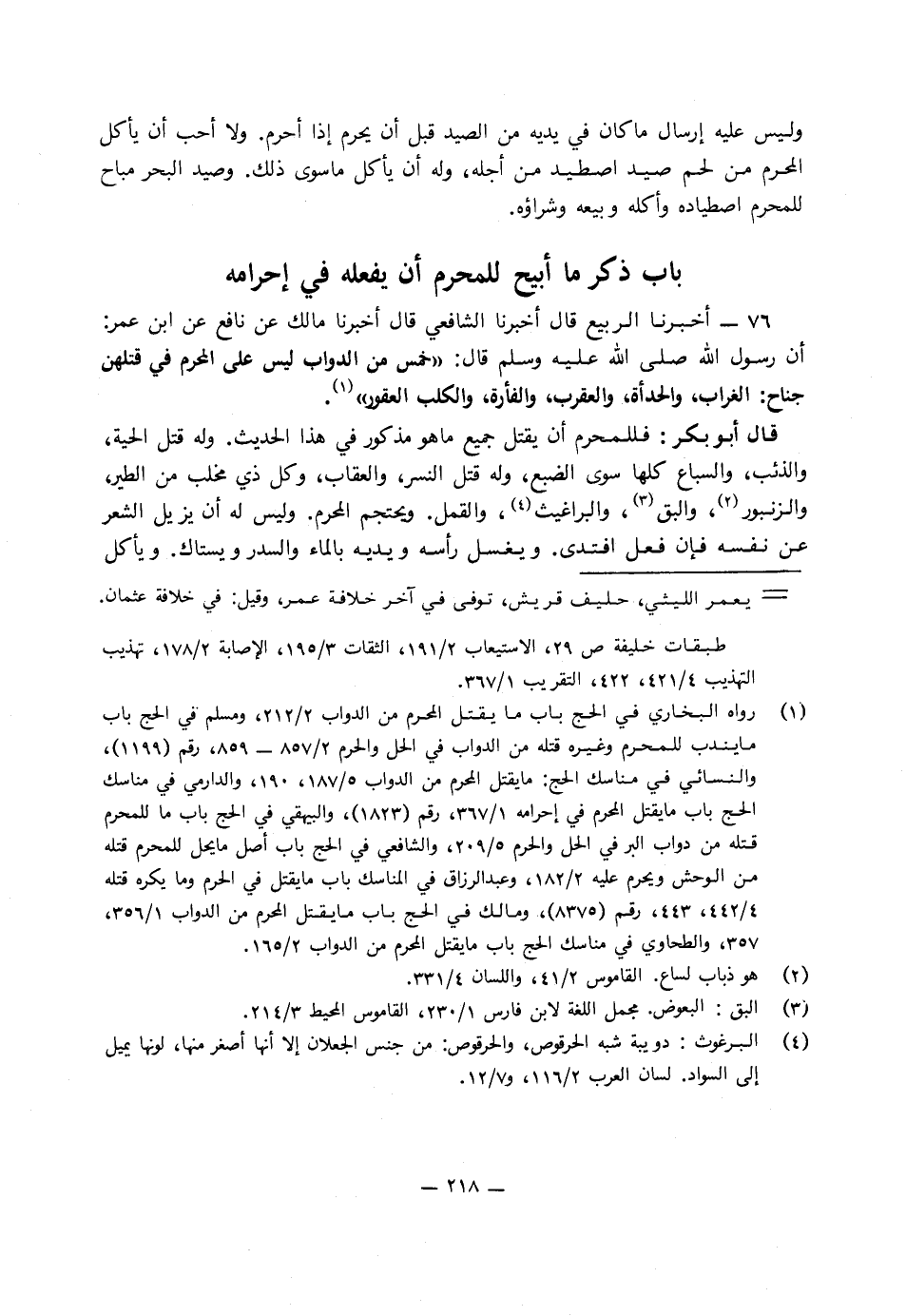 76 - أَخْبَرَنَا الرَّبِيعُ، قَالَ: أَخْبَرَنَا الشَّافِعِيُّ، قَالَ: أَخْبَرَنَا مَالِكٌ، عَنْ نَافِعٍ، عَنِ ابْنِ عُمَرَ، أَنَّ رَسُولَ اللَّهِ صَلَّى اللَّهُ عَلَيْهِ وَسَلَّمَ، قَالَ: " خَمْسٌ مِنَ الدَّوَابِّ لَيْسَ عَلَى الْمُحْرِمِ فِي قَتْلِهِنَّ جُنَاحٌ: الْغُرَابُ، وَالْحِدَأَةُ، وَالْعَقْرَبُ، وَالْفَأْرَةُ، وَالْكَلْبُ الْعَقُورُ "