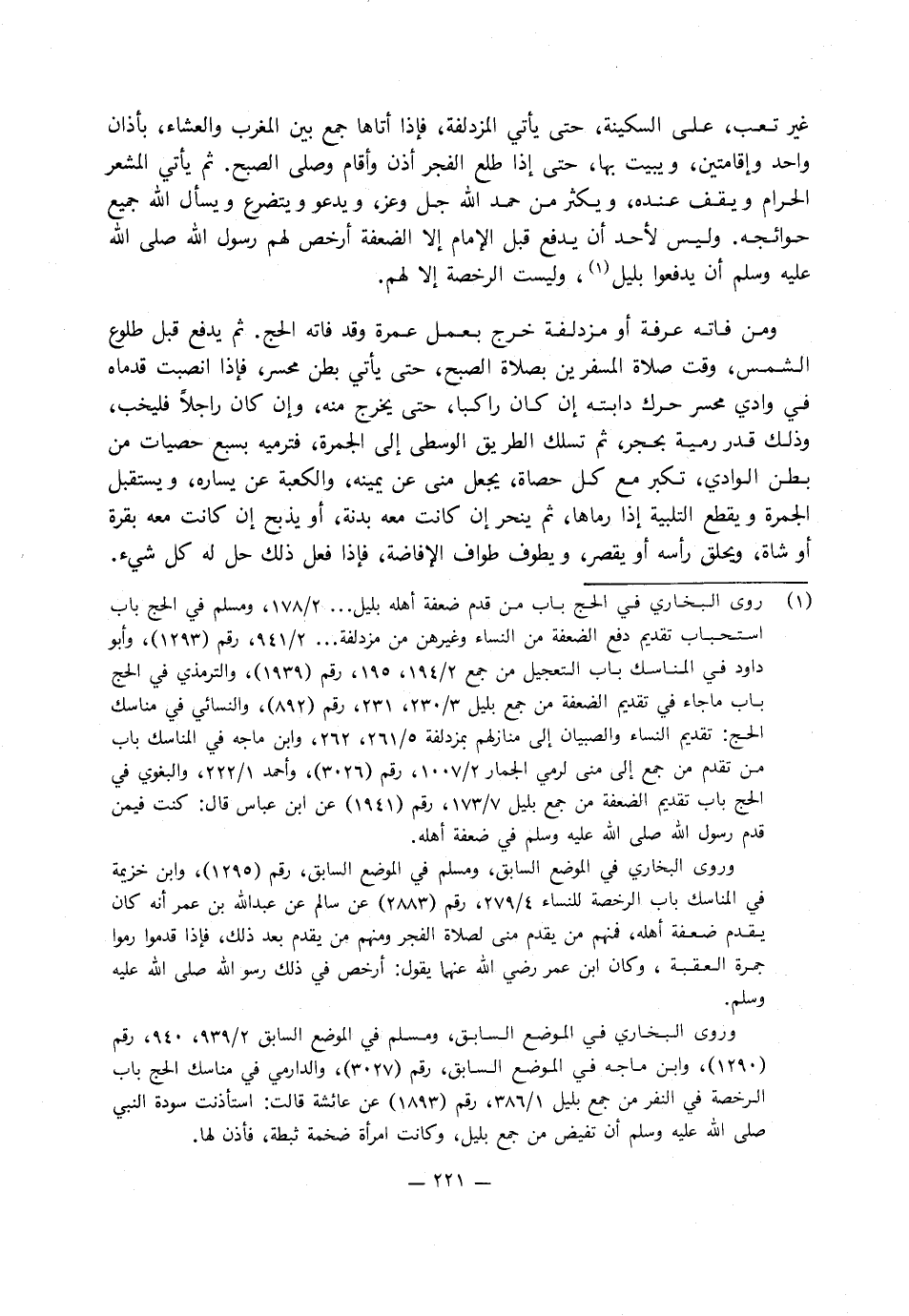 غير تعب عَلَى السكينة حَتَّى يأتي مزدلفة، فإذا أتاها جمع بين المغرب والعشاء بأذان واحد وإقامة ويبيت بها، حَتَّى إذا طلع الفجر أذن وأقام وصلى الصبح، ثم يأتي المشعر الحرام ويقف عنده ويكثر من حمد اللَّه جل وعلا، ويدعو ويتضرع ويسأل اللَّه جميع حوائجه، وليس لأحد أن يدفع قبل الإمام إلا الضعفة أرخص لهم رَسُول اللَّهِ صَلَّى اللَّهُ عَلَيْهِ وَسَلَّمَ أن يدفعوا بليل وليست الرخصة إلا لهم، ومن فاته عرفة أو مزدلفة خرج بعمل عمرة وقد فاته الحج، ثم يدفع قبل طلوع الشمس وقت صلاة المسفرين بصلاة الصبح حَتَّى يأتي بطن محسر، فإذا انصبت قدماه في وادي محسر حرك دابته إن كَانَ راكبًا حَتَّى يخرج منه، وإن كَانَ راجلا فليتجنب وذلك قدر رمية بحجر، ثم يسلك الطريق الوسطى إِلَى الجمرة فيرميها بسبع حصيات من بطن الوادي يكبر مع كل حصاة، يجعل منى عن يمينه والكعبة عن يساره، ويستقبل الجمرة ويقطع التلبية إذا رماها، ثم ينحر إن كانت مَعَهُ بدنة أو يذبح إن كانت مَعَهُ بقرة أو شاة، ويحلق رأسه أو يقصر، ويطوف طواف الإفاضة، فإذا فعل ذَلِكَ حل لَهُ كل شيء.