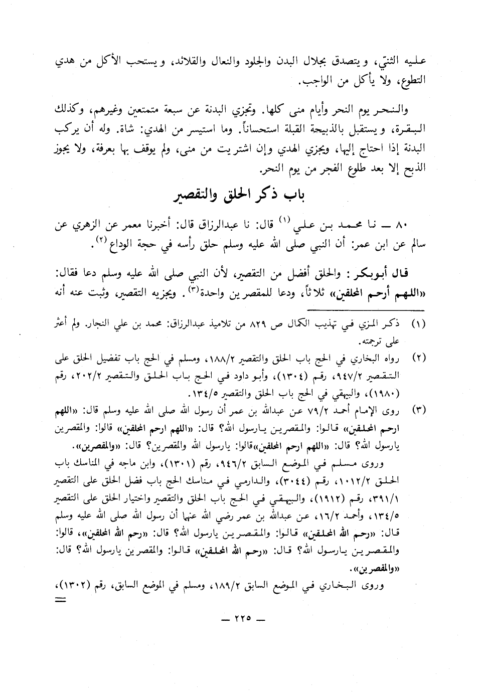 80 - نا مُحَمَّدُ بْنُ عَلِيٍّ، قَالَ: نا عَبْدُ الرَّزَّاقِ، قَالَ: أَخْبَرَنَا مَعْمَرٌ، عَنِ الزُّهْرِيِّ، عَنْ سَالِمٍ، عَنِ ابْنِ عُمَرَ، أَنَّ النَّبِيَّ صَلَّى اللَّهُ عَلَيْهِ وَسَلَّمَ «حَلَقَ رَأْسَهُ فِي حَجَّةِ الْوَدَاعِ»