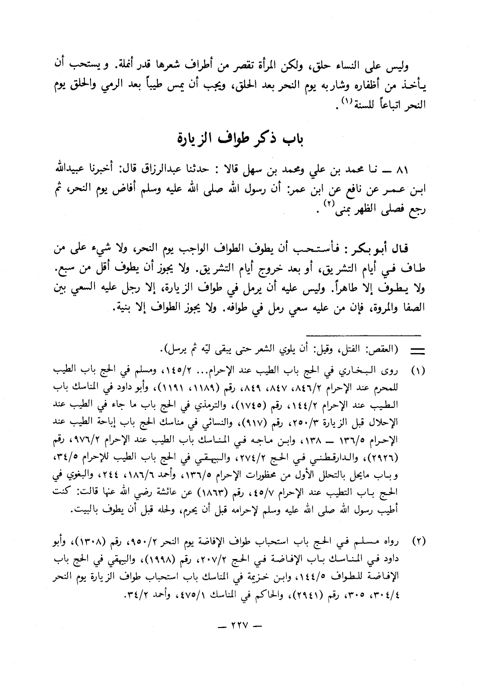 81 - نا مُحَمَّدُ بْنُ عَلِيٍّ، وَمُحَمَّدُ بْنُ سَهْلٍ، قَالا: أَخْبَرَنَا عَبْدُ الرَّزَّاقِ، قَالَ: أَخْبَرَنَا عُبَيْدُ اللَّهِ بْنُ عُمَرَ، عَنْ نَافِعٍ، عَنِ ابْنِ عُمَرَ، أَنَّ رَسُولَ اللَّهِ صَلَّى اللَّهُ عَلَيْهِ وَسَلَّمَ «أَفَاضَ يَوْمَ النَّحْرِ، ثُمَّ رَجَعَ فَصَلَّى الظُّهْرَ بِمِنًى»
