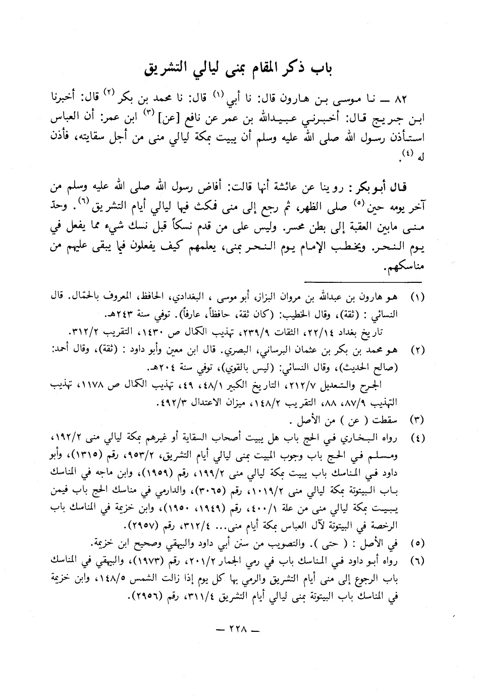 82 - نا مُوسَى بْنُ هَارُونَ، قَالَ: نا أَبِي، قَالَ: نا مُحَمَّدُ بْنُ بَكْرٍ، قَالَ: أَخْبَرَنَا ابْنُ جُرَيْجٍ، قَالَ: أَخْبَرَنَا عُبَيْدُ اللَّهِ بْنُ عُمَرَ، عَنْ نَافِعٍ، عَنِ ابْنِ عُمَرَ، أَنَّ الْعَبَّاسَ «اسْتَأْذَنَ رَسُولَ اللَّهِ صَلَّى اللَّهُ عَلَيْهِ وَسَلَّمَ أَنْ يَبِيتَ بِمَكَّةَ لَيَالِيَ مِنًى مِنْ أَجْلِ سِقَايَتِهِ فَأَذِنَ لَهُ»