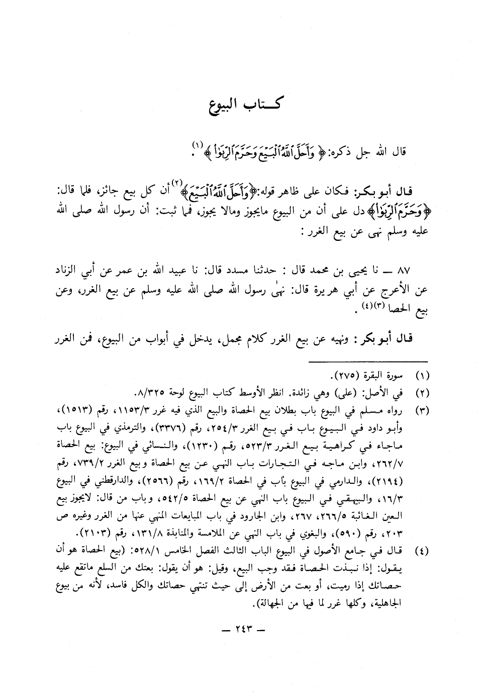 87 - نا يَحْيَى بْنُ مُحَمَّدٍ، قَالَ: حَدَّثَنَا مُسَدَّدٌ، قَالَ: نا عُبَيْدُ اللَّهِ بْنُ عُمَرَ، عَنْ أَبِي الزِّنَادِ، عَنِ الأَعْرَجِ، عَنْ أَبِي هُرَيْرَةَ، قَالَ: «نَهَى رَسُولُ اللَّهِ صَلَّى اللَّهُ عَلَيْهِ وَسَلَّمَ عَنْ بَيْعِ الْغَرَرِ، وَعَنْ بَيْعِ الْحَصَى»