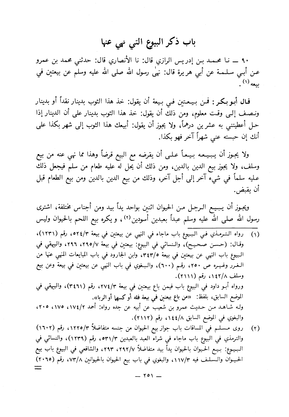 90 - نا مُحَمَّدُ بْنُ إِدْرِيسَ الرَّازِيُّ، قَالَ: نا الأَنْصَارِيُّ، قَالَ: حَدَّثَنِي مُحَمَّدُ بْنُ عَمْرٍو، عَنْ أَبِي سَلَمَةَ، عَنْ أَبِي هُرَيْرَةَ، قَالَ: «نَهَى رَسُولُ اللَّهِ صَلَّى اللَّهُ عَلَيْهِ وَسَلَّمَ عَنْ بَيْعَتَيْنِ فِي بَيْعَةٍ»