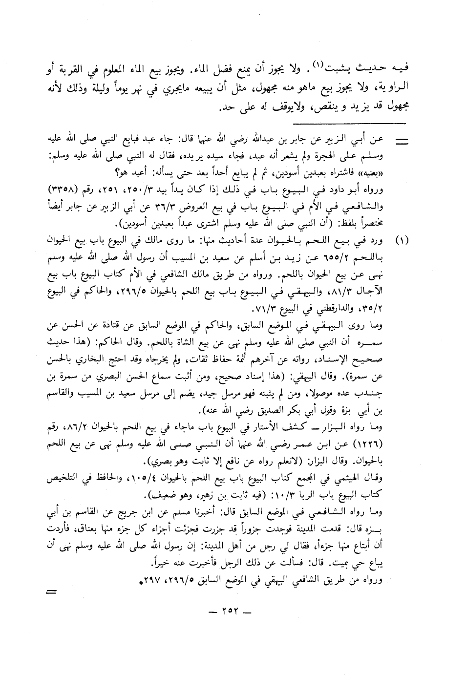 فِيهِ حديث يثبت، وَلا يجوز أن يبيع فضل الْمَاء، ويجوز بيع الْمَاء المعلوم في القربة أو الراوية، وَلا يجوز بيع مَا هو منه مجهول مثل أن يبيعه مَا يجري في نهر يومًا وليلة، وذلك لأنه مجهول قد يزيد وينقص، وَلا يوقف لَهُ عَلَى حد،