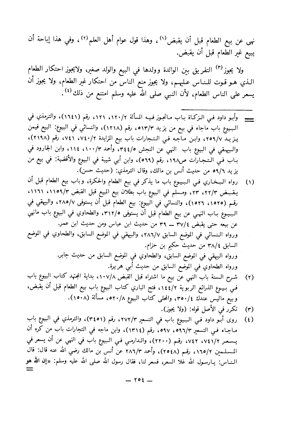 «نهى عن بيع الطعام قبل أن يقبض» وهذا قول عوام أهل العلم وفي هذا إباحة أن يبيع غير الطعام قبل أن يقبض، وَلا يجوز التفريق بين الوالدة وولدها في البيع والولد صغير، وَلا يجوز احتكار الطعام الذي هو قوت للناس عليهم، وَلا يجوز منع الناس من احتكار غير الطعام، وَلا يجوز أن يسعر عَلَى الناس الطعام، لأن النَّبِيّ صَلَّى اللَّهُ عَلَيْهِ وَسَلَّمَ امتنع من ذَلِكَ.
