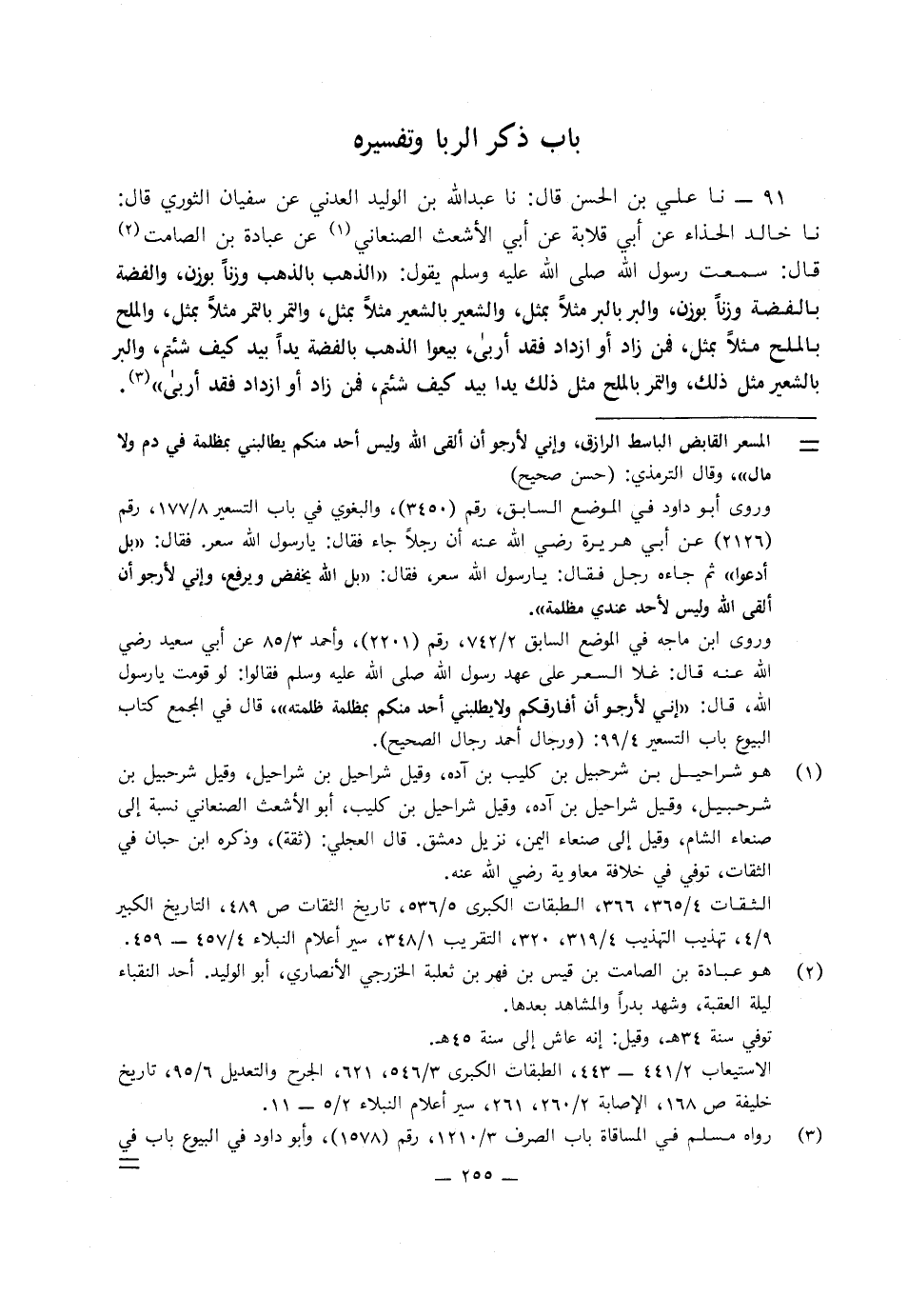 91 - نا عَلِيُّ بْنُ الْحَسَنِ، قَالَ: نا عَبْدُ اللَّهِ بْنُ الْوَلِيدِ الْعَدَنِيُّ، عَنْ سُفْيَانَ الثَّوْرِيِّ، قَالَ: نا خَالِدٌ الْحَذَّاءُ، عَنْ أَبِي قِلابَةَ، عَنْ أَبِي الأَشْعَثِ الصَّنْعَانِيِّ، عَنْ عُبَادَةَ بْنِ الصَّامِتِ، قَالَ: سَمِعْتُ رَسُولَ اللَّهِ صَلَّى اللَّهُ عَلَيْهِ وَسَلَّمَ، يَقُولُ: «الذَّهَبُ بِالذَّهَبِ وَزْنًا بِوَزْنٍ، وَالْفِضَّةُ بِالْفِضَّةِ وَزْنًا بِوَزْنٍ، وَالْبُرُّ بِالْبُرِّ مِثْلا بِمِثْلٍ، وَالشَّعِيرُ بِالشَّعِيرِ مِثْلا بِمِثْلٍ، وَالتَّمْرُ بِالتَّمْرِ مِثْلا بِمِثْلٍ، وَالْمِلْحُ بِالْمِلْحِ مِثْلا بِمِثْلٍ، فَمَنْ زَادَ أَوِ ازْدَادَ فَقَدْ أَرْبَى، بِيعُوا الذَّهَبَ بِالْفِضَّةِ يَدًا بِيَدٍ كَيْفَ شِئْتُمْ، وَالْبُرَّ بِالشَّعِيرِ مِثْلَ ذَلِكَ، وَالتَّمْرَ بِالْمِلْحِ مِثْلَ ذَلِكَ يَدًا بِيَدٍ كَيْفَ شِئْتُمْ»