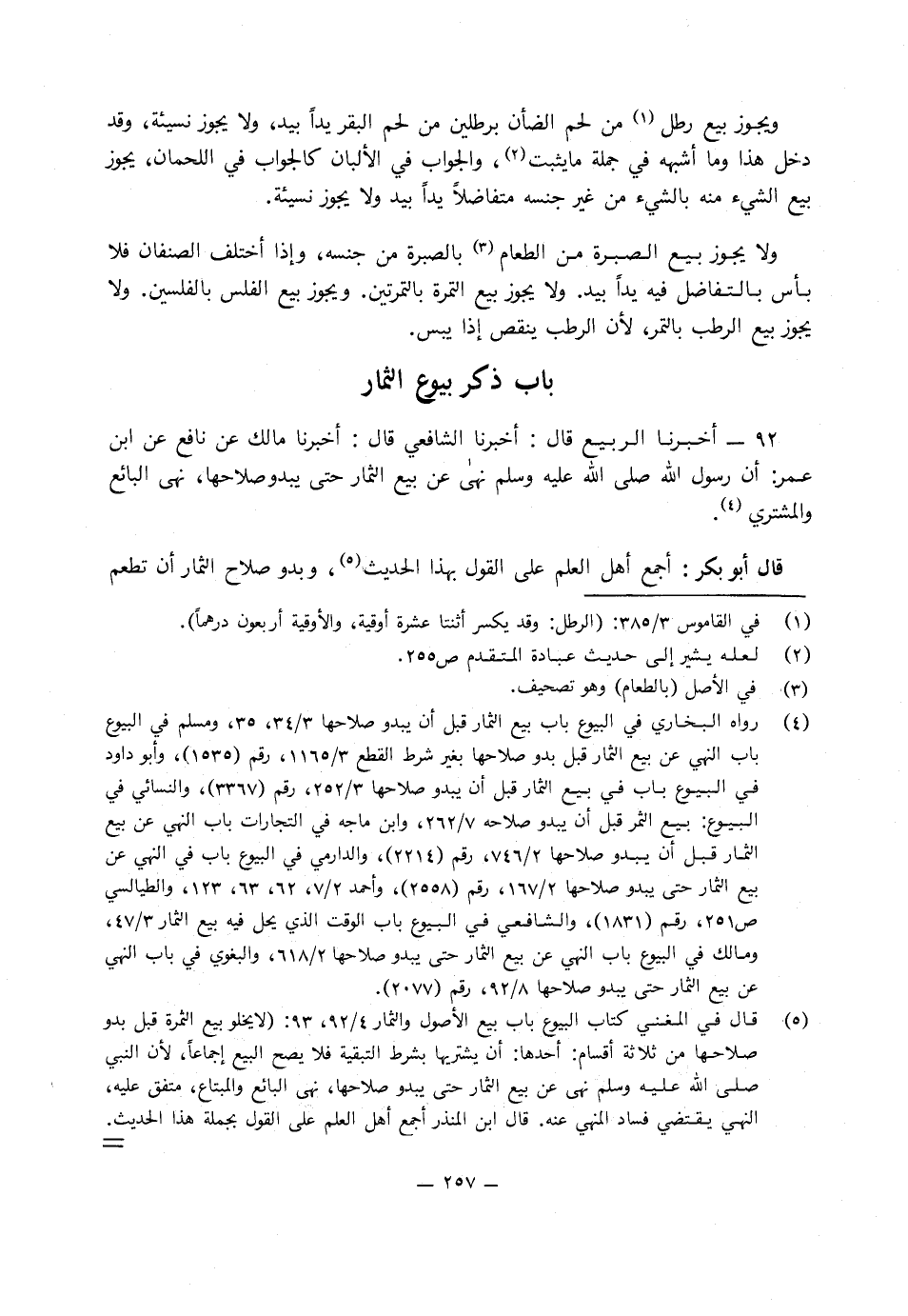 92 - أَخْبَرَنَا الرَّبِيعُ، قَالَ: أَخْبَرَنَا الشَّافِعِيُّ، قَالَ: أَخْبَرَنَا مَالِكٌ، عَنْ نَافِعٍ، عَنِ ابْنِ عُمَرَ، أَنَّ رَسُولَ اللَّهِ صَلَّى اللَّهُ عَلَيْهِ وَسَلَّمَ «نَهَى عَنْ بَيْعِ الثِّمَارِ حَتَّى يَبْدُوَ صَلاحُهَا، نَهَى الْبَائِعَ وَالْمُشْتَرِيَ»