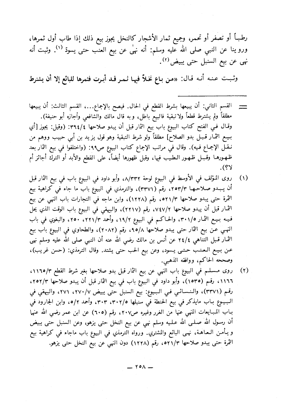 رطبا، أو تصفر أو تحمر، وجميع ثمار الأشجار كالنخل يجوز بيع ذَلِكَ إذا طاب أول ثمرها، وروينا عَنِ النَّبِيِّ صَلَّى اللَّهُ عَلَيْهِ وَسَلَّمَ، أنه «نهى عن بيع العنب حَتَّى يسود» ، وثبت أنه «نهى عن بيع السنبل حَتَّى يبيض» ، وثبت عنه، أنه قَالَ: «من باع نخلا فيها ثمر قد أبرت فثمرها للبائع إلا أن يشترط