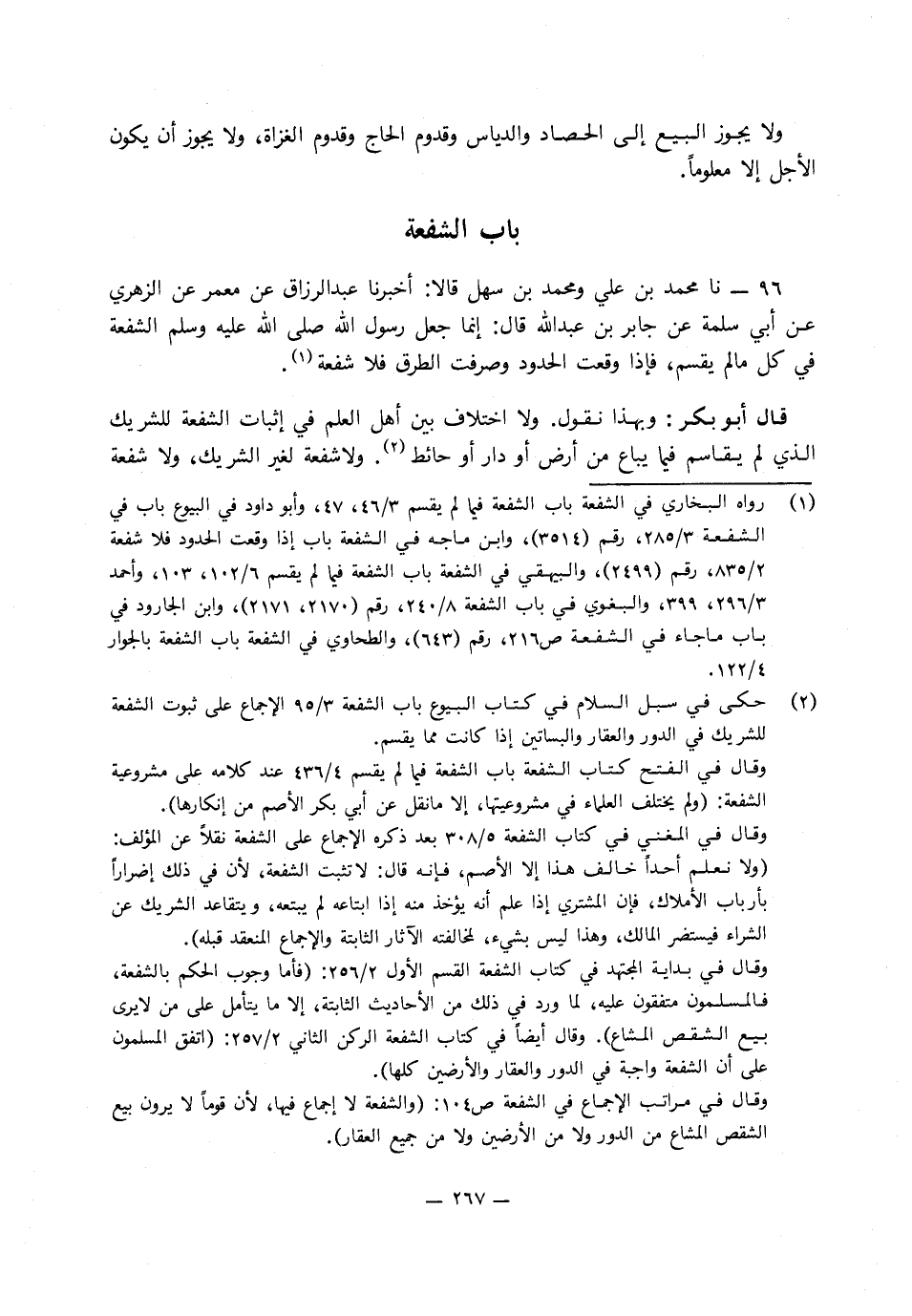 96 - نا مُحَمَّدُ بْنُ عَلِيٍّ، وَمُحَمَّدُ بْنُ سَهْلٍ، قَالا: أَخْبَرَنَا عَبْدُ الرَّزَّاقِ، عَنْ مَعْمَرٍ، عَنِ الزُّهْرِيِّ، عَنْ أَبِي سَلَمَةَ، عَنْ جَابِرِ بْنِ عَبْدِ اللَّهِ، قَالَ: وَإِنَّمَا «جَعَلَ رَسُولُ اللَّهِ صَلَّى اللَّهُ عَلَيْهِ وَسَلَّمَ الشُّفْعَةَ فِي كُلِّ مَا لَمْ يُقْسَمْ، فَإِذَا وَقَعَتِ الْحُدُودُ وَصُرِفَتِ الطُّرُقُ فَلا شُفْعَةَ»