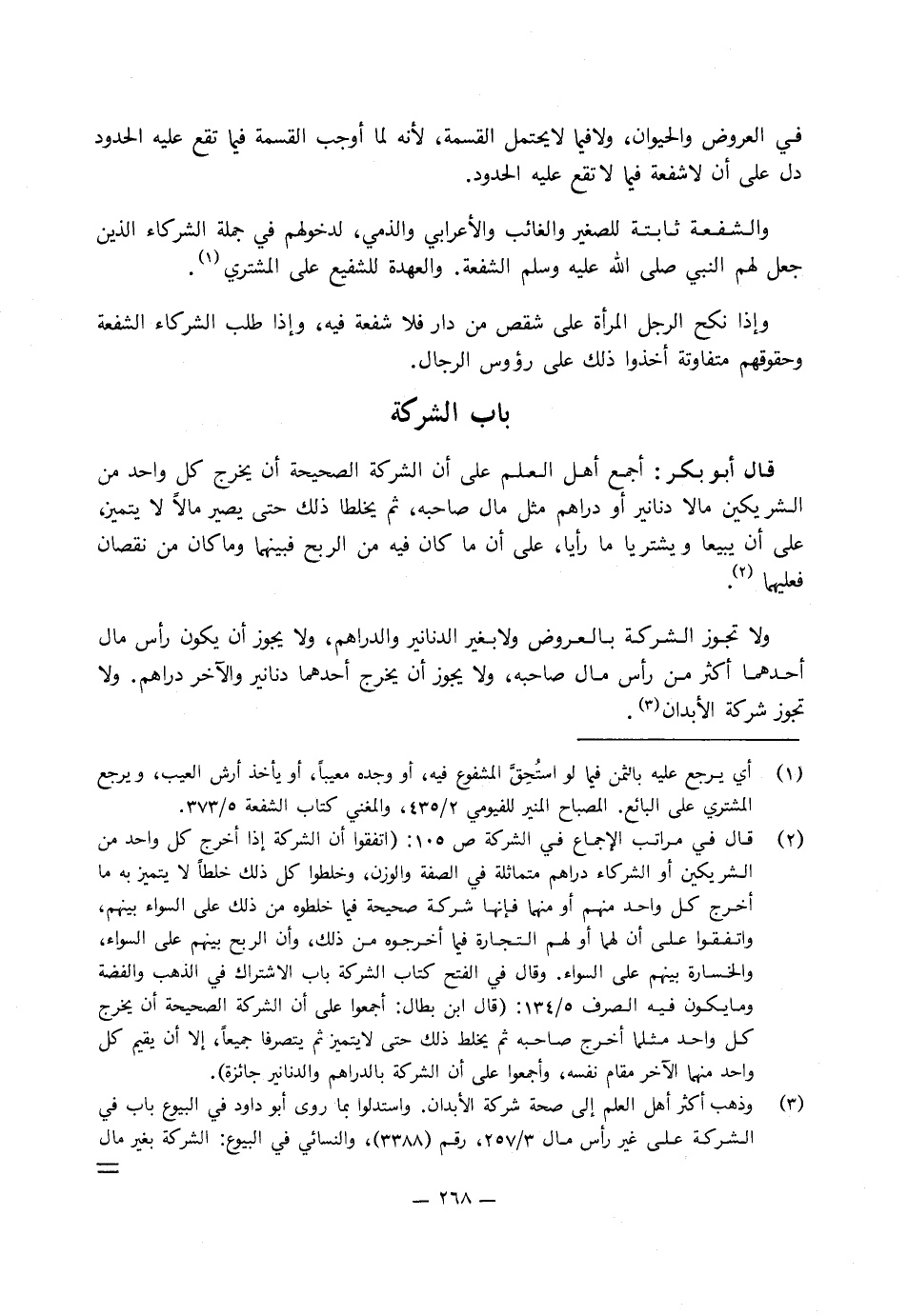 أجمع أهل العلم عَلَى أن الشركة الصحيحة أن يخرج كل واحد من الشريكين مالا، دنانير أو دراهم مثل مال صاحبه، ثم يخلطا ذَلِكَ حَتَّى يصير مالا لا يتميز عَلَى أن يبيعا ويشتريا مَا رأيا عَلَى أن مَا كَانَ فِيهِ من الربح فبينهما، وما كَانَ من نقصان فعليهما، وَلا تجوز الشركة بالعروض وَلا بغير الدنانير والدراهم، وَلا يجوز أن يكون رأس مال أحدهما أكثر من رأس مال صاحبه، وَلا يجوز أن يخرج أحدهما دنانير والآخر دراهم، وَلا تجوز شركة الأبدان.