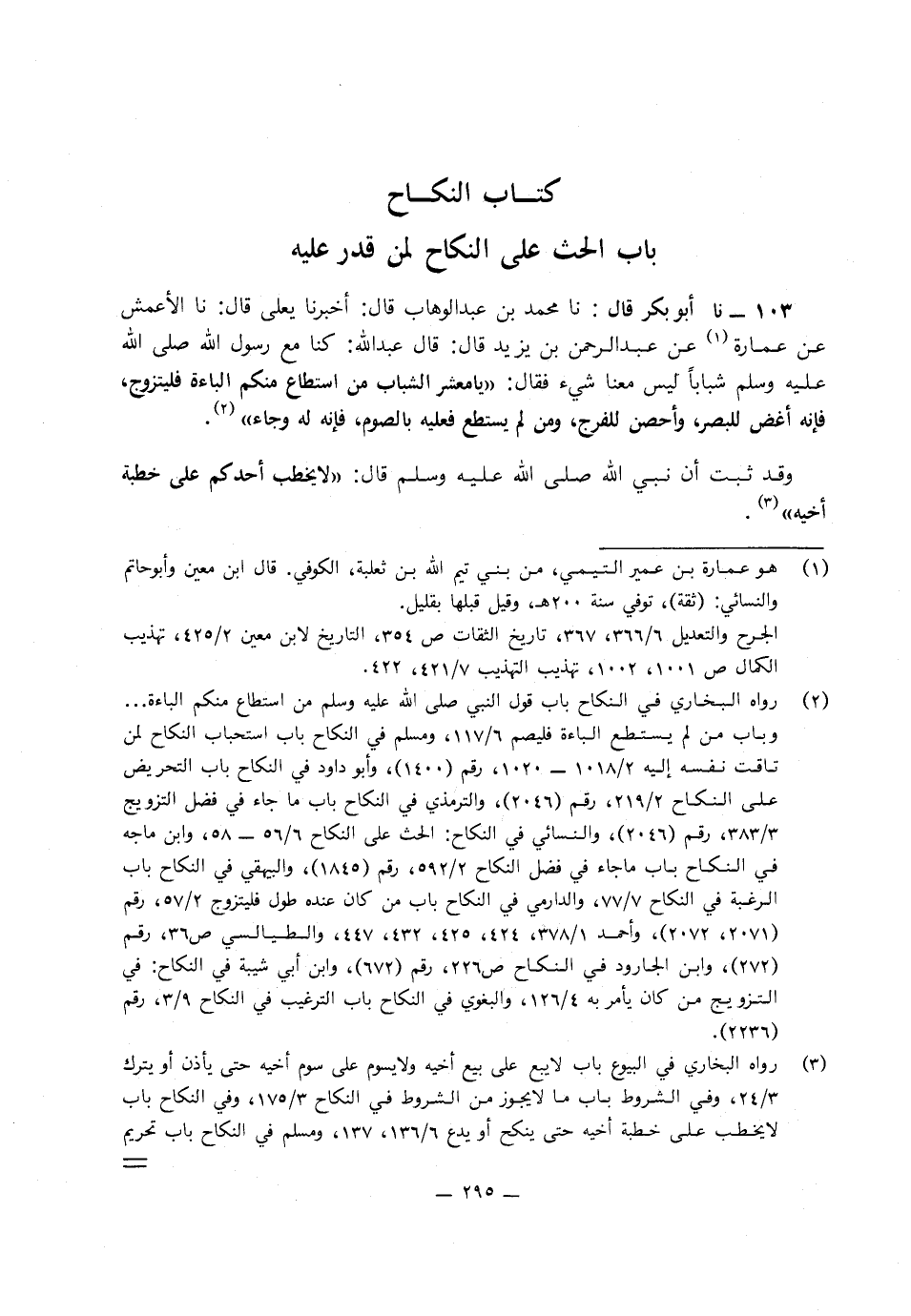 103 - نا مُحَمَّدُ بْنُ عَبْدِ الْوَهَّابِ، قَالَ: أَخْبَرَنَا يَعْلَى، قَالَ: نا الأَعْمَشُ، عَنْ عُمَارَةَ، عَنْ عَبْدِ الرَّحْمَنِ بْنِ يَزِيدَ، قَالَ: قَالَ عَبْدُ اللَّهِ: كُنَّا مَعَ رَسُولِ اللَّهِ صَلَّى اللَّهُ عَلَيْهِ وَسَلَّمَ شَبَابًا لَيْسَ مَعَنَا شَيْءٌ، فَقَالَ: «يَا مَعْشَرَ الشَّبَابِ، مَنِ اسْتَطَاعَ مِنْكُمُ الْبَاءَةَ فَلْيَتَزَوَّجْ، فَإِنَّهُ أَغَضُّ لِلْبَصَرِ، وَأَحْصَنُ لِلْفَرْجِ، وَمَنْ لَمْ يَسْتَطِعْ فَعَلَيْهِ بِالصَّوْمِ فَإِنَّهُ لَهُ وِجَاءٌ» .