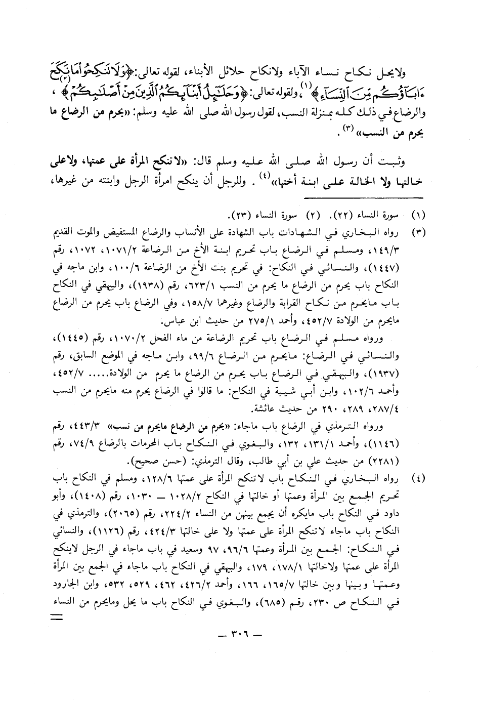 وثبت أَنَّ رَسُولَ اللَّهِ صَلَّى اللَّهُ عَلَيْهِ وَسَلَّمَ، قَالَ: «لا تنكح الْمَرْأَة عَلَى عمتها وَلا عَلَى خالتها وَلا الخالة عَلَى ابنة أختها» .