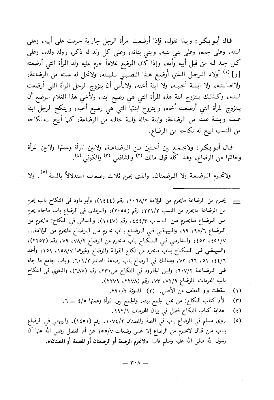 وبهذا نقول فإن أرضعت امرأة الرجل جارية حرمت عَلَى أَبِيهِ وعلى ابنه وعلى جده وعلى بني بنيه وبني بناته، وعلى كل ولد لَهُ ذكر وولد ولده، وعلى كل جد لَهُ من قبل أَبِيهِ وأمه، وإذا كَانَ المرضع غلاما حرم عليه ولد الْمَرْأَة التي أرضعته، وأولاد الرجل الذي أرضع هذا الصبي بلبنه وَلا تحل لَهُ عمته من الرضاعة وَلا خالته وَلا ابنة أخيه وَلا ابنة أخته، وَلا بأس أن يتزوج الرجل الْمَرْأَة التي أرضعت ابنه، كذلك يتزوج ابنة الْمَرْأَة التي هِيَ رضيع أَبِيهِ ولأخي هذا الغلام المرضع أن يتزوج الْمَرْأَة التي أرضعت أخاه، ويتزوج ابنتها التي هِيَ رضيع أخيه، وينكح الرجل ابنة عمه وابنة عمته من الرضاعة وابنة خاله وابنة خالته من الرضاعة، كل مَا أبيح لَهُ نكاحه من النسب أبيح لَهُ نكاحه من الرضاع.