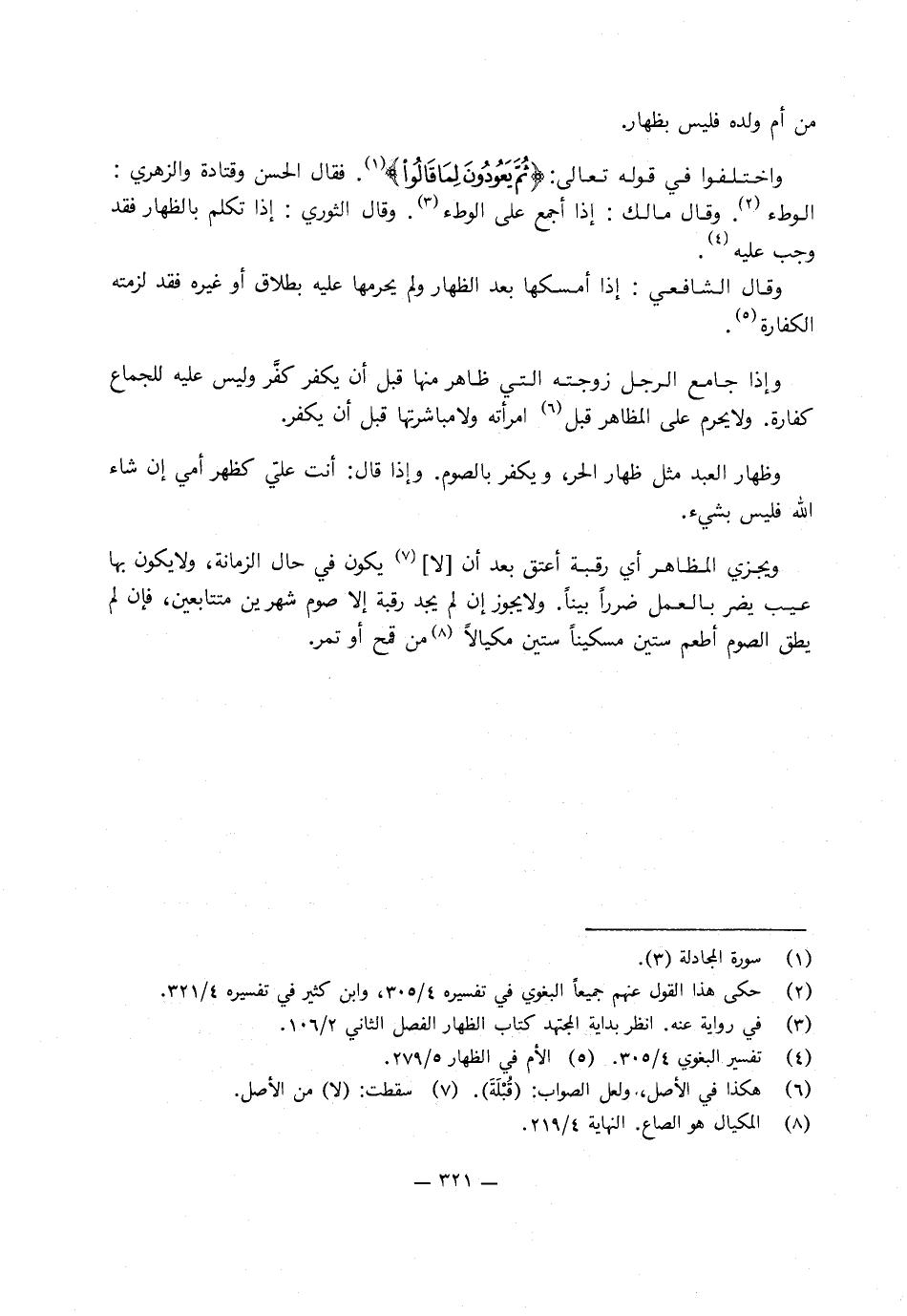 أم ولده فليس بظهار، واختلفوا في قوله: {ثُمَّ يَعُودُونَ لِمَا قَالُوا} [المجادلة: 3] ، فَقَالَ الحسن، وقتادة، والزُّهْرِيّ: الوطء.